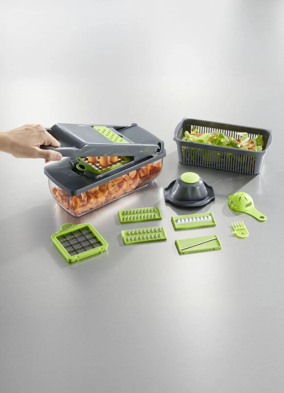 Multifunktionsschneider – Schneidet Stifte, Würfel oder Scheiben – sauber, sicher und schnell. 2 Würfelklingen für kleine und große Würfel (11×11 mm, 6×6 mm). Einfach die Zutaten auf die Messereinsätze legen und den Stempel herunterdrücken. Das Schnittgut wird im 1.350 ml großen Behälter aufgefangen. 3 Reiben (fein, mittel und grobe Käsereibe), Schneidemesser, Wellenschneider, Eiertrenner, herausnehmbarem Sieb, praktischer Fingerschutz und Reinigungsbürste. Zubehör platzsparend und griffbereit im Behälter. Ideal auch für Obstsalate. Maße: B32xH11,5xT11,5 cm. Alle Teile sind Spülmaschinengeeignet.