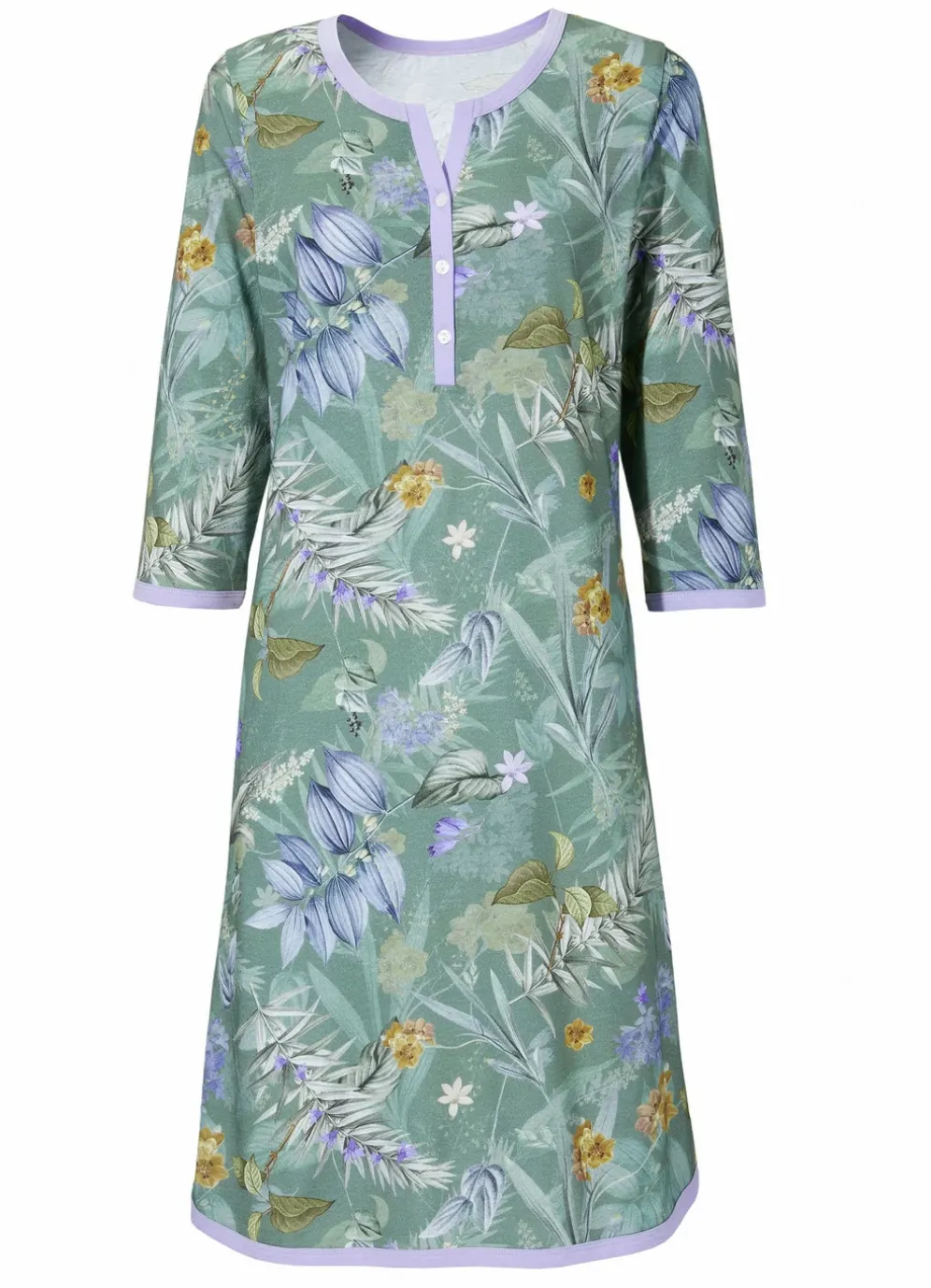 Nachthemd, 3/4 lange Ärmel mit Serafino-Ausschnitt in Salbei-Flieder-Bunt und in Größe 38.