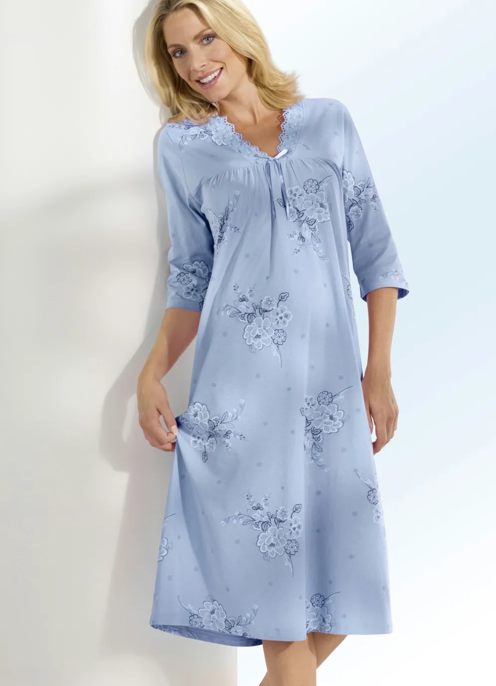 Nachthemd, 3/4-lange Ärmel und V-Ausschnitt in Hellblau-Bunt und in Größe 40.