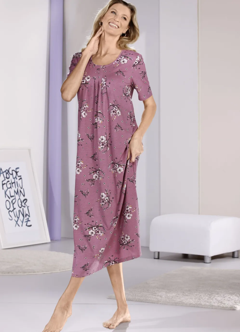Nachthemd, knöchellang mit kurzen Ärmeln in Mauve-Bunt und in Größe 38.
