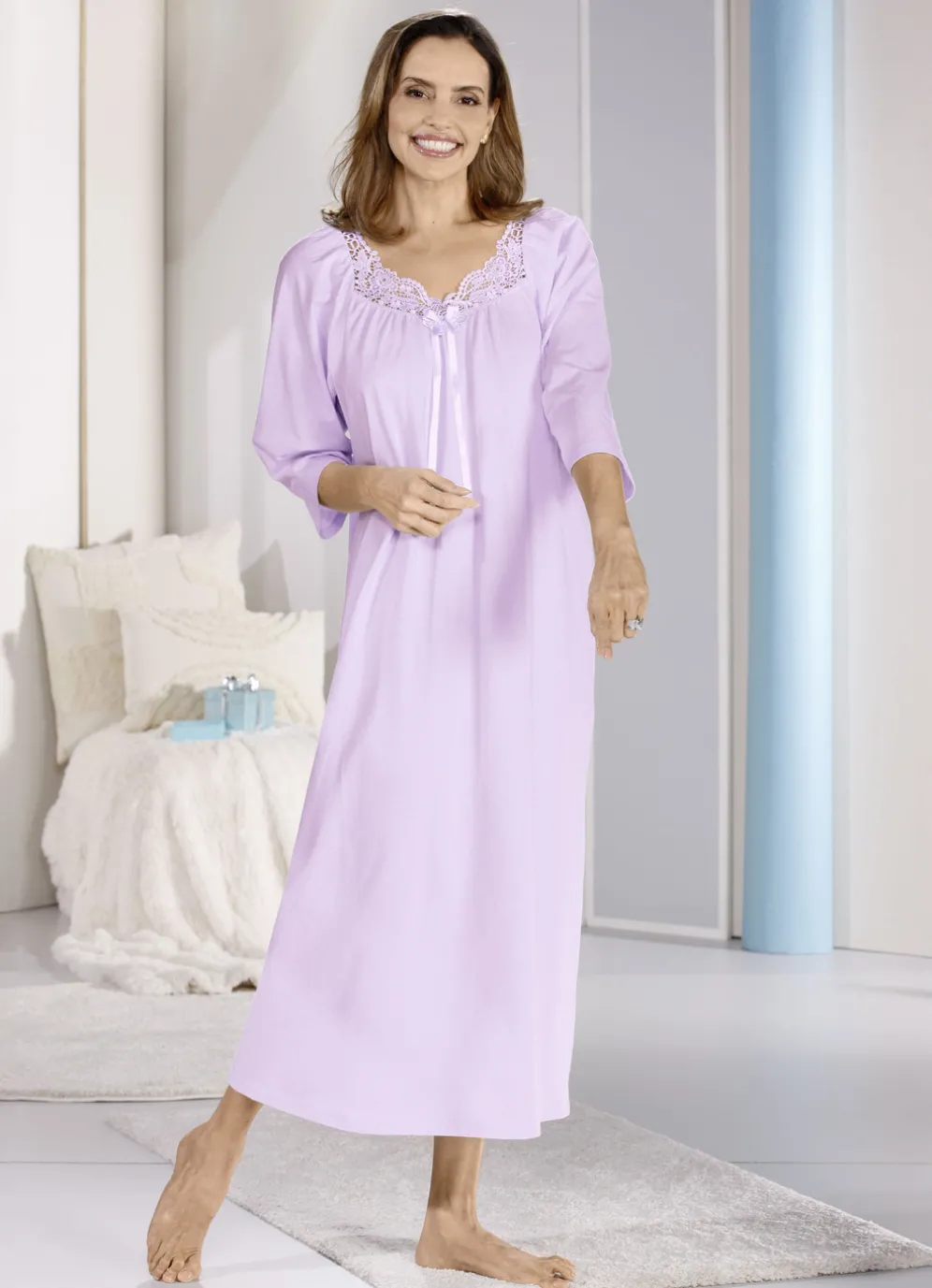 Knöchellanges Nachthemd mit hübscher Stickereispitze am Dekolleté, Satinzierschleife, Raffungen
