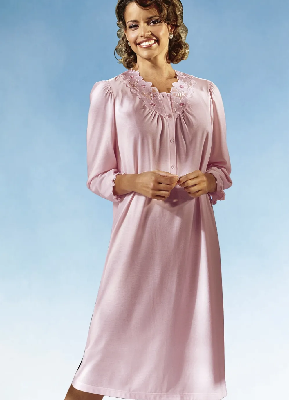Bildschönes, wadenlanges Nachthemd mit feiner Spitze am vorderen Dekolleté, langer Knopfleiste sowie Raffung vorne und am Ansatz der langen Ärmel mit gebogten Abschlüssen.