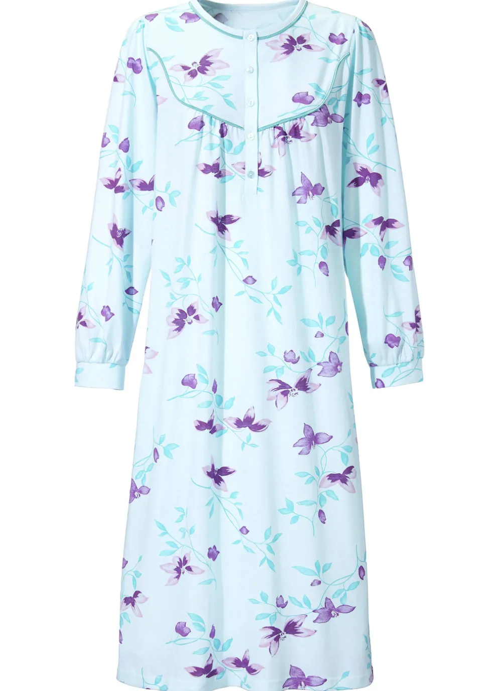 Wadenlanges Nachthemd in Aqua-Pflaume-Bunt, mit langer Knopfleiste, Kontrastpaspel an Ausschnitt