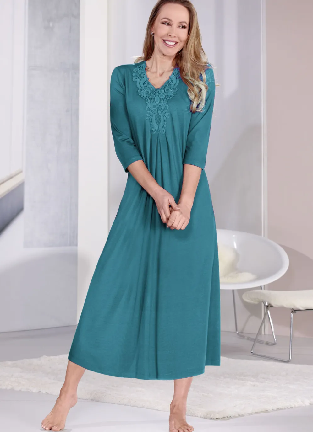 Apartes, knöchellanges Nachthemd: großzügige Motivspitze, Kellerfalten, 3/4-lange Ärmel.
