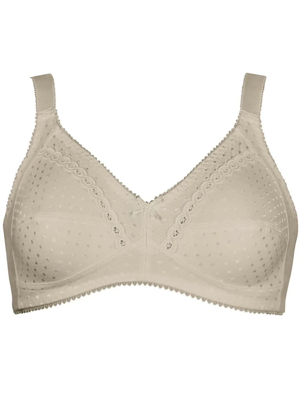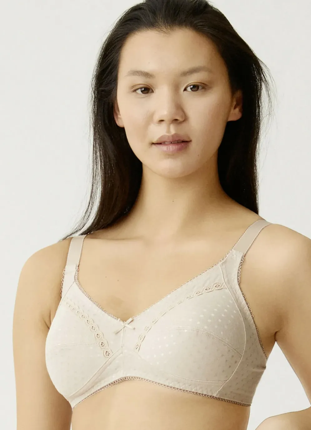 Hautsympathischer „Naturana“-BH mit dezent glänzendem Jacquard-Dessin, Spitzenband im Vorderteil, unterlegten Untercups sowie verstellbaren Stretchträgern.