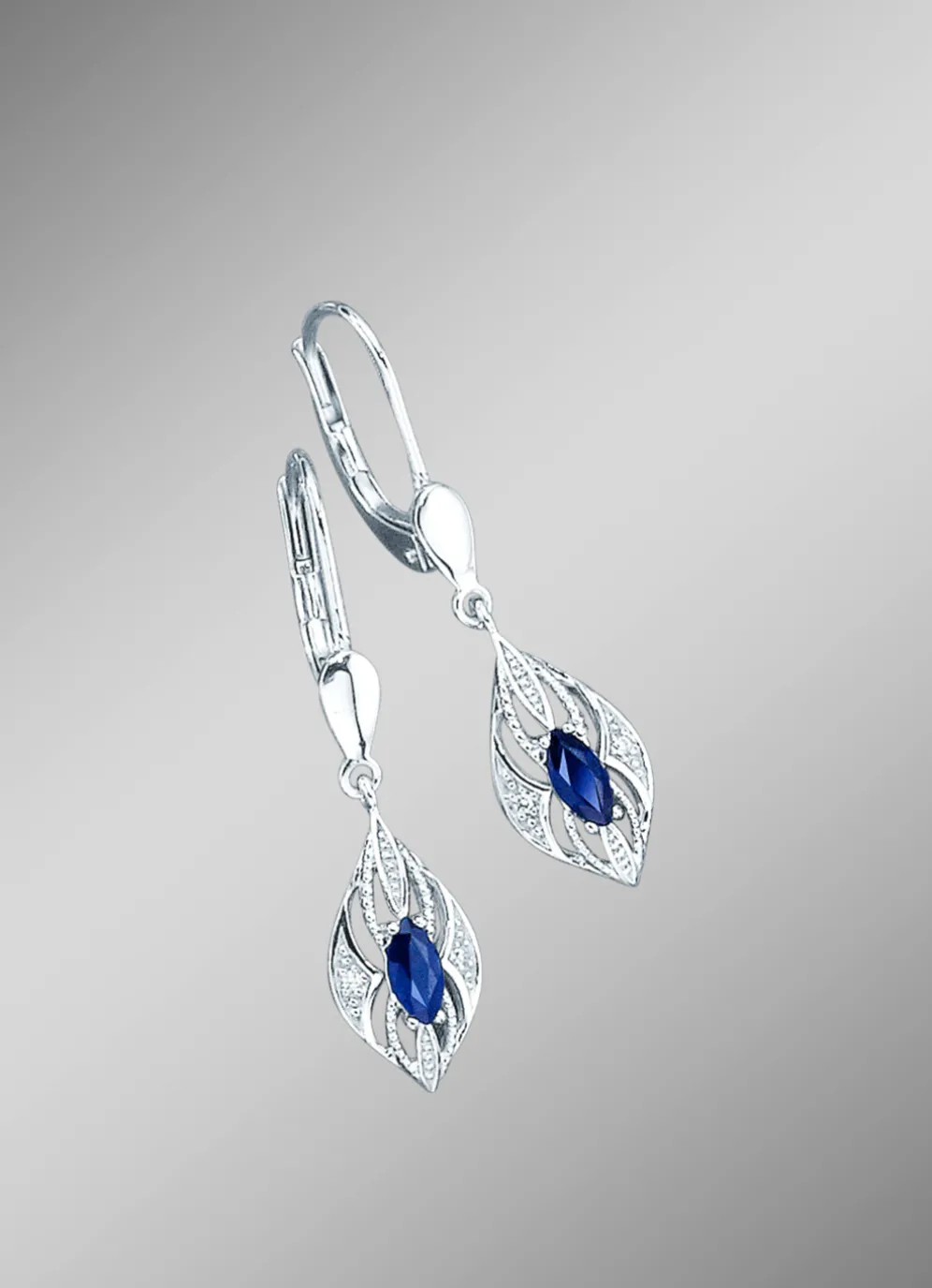 Diese spitzovalen, außen ziselierten Ohrringe, die Sie wahlweise in Weißgold 585/- fein oder Weißgold 333/- fein erhalten, sorgen für einen femininen Auftritt. Die wunderschönen, echt blauen Safire im Navetteschliff werden von 4 Brillanten, Weiß, Piqué 2, perfekt in Szene gesetzt. Die Ohrringe sind 29 mm lang und mit Bügelverschuss gearbeitet.