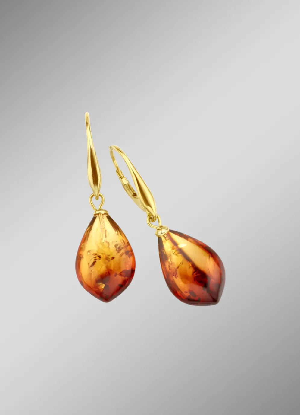 Diese Ohrringe aus Silber 925/- fein, vergoldet in Tropfenform mit echt Bernstein haben eine Länge von 38 mm und sind mit einem Bügelverschluss ausgestattet.