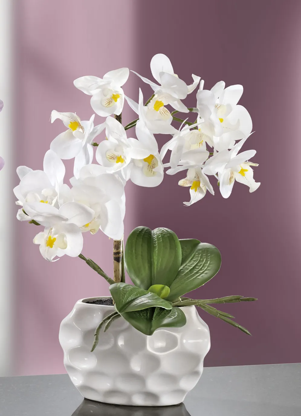 Orchideen-Gesteck in Keramikvase in Weiss.