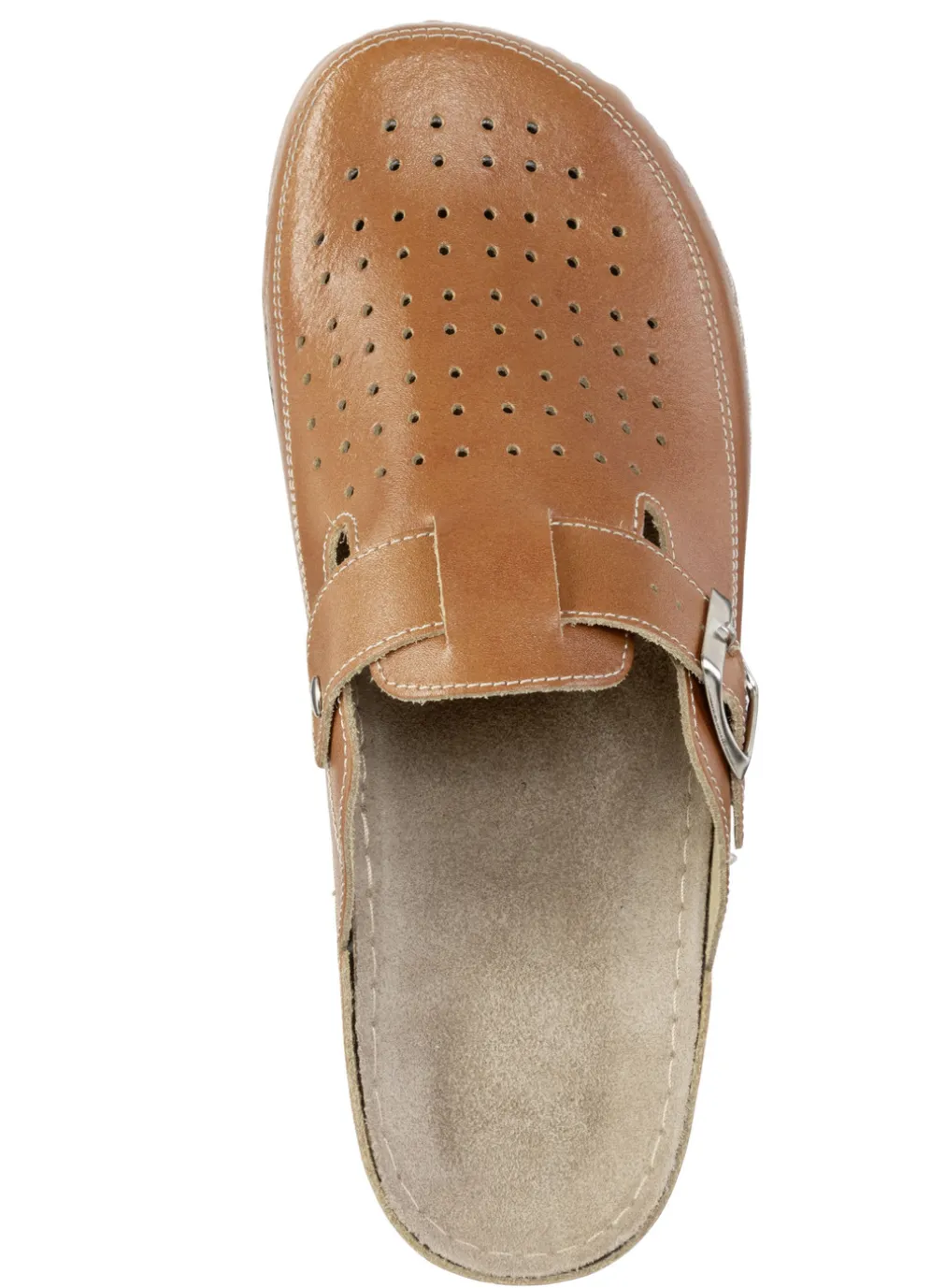 Pantolette aus Nappaleder mit luftiger Perforation: verstellbare Schließe, gepolstertes Lederfußbett, leichte PU-Laufsohle