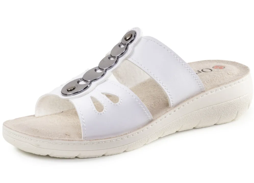 Pantolette mit glänzendem Schmuck in Weiss und in Größe 40.