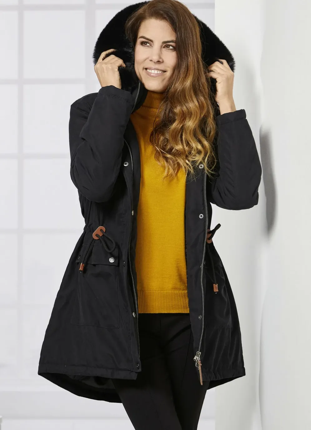Ein herrliches Trageerlebnis verspricht dieser schwarze Parka mit tollen Details: durch Riegel und Schnalle größenverstellbare, abnehmbare Kapuze mit Riegel, Druckern, abnehmbarem Kunstpelz-Besatz und Plüsch-Innenausstattung, durch 2-Wege-Reißverschluss unter der Druckerleiste hoch schließbarer Stehkragen mit Plüsch-Innenbeleg, Reißverschluss-Brusttasche, Taillen-Durchzugsband und Stopper, aufgesetzte Taschen mit Patte und Druckern, elastische Windfangärmel, eine Innentasche sowie leicht verlängertes, abgerundetes Rückteil. Länge ca. 87 cm.