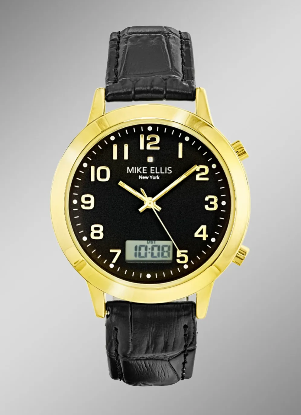 Extravagante Partnerfunkuhren der angesagten Marke Mike Ellis New York. Diese Uhren glänzen mit einem vergoldetem Edelstahlgehäuse. Die stilvolle Ergänzung sind das schwarze Zifferblatt mit goldfarbenem Index und das schwarze Lederband mit Kroko-Prägung.