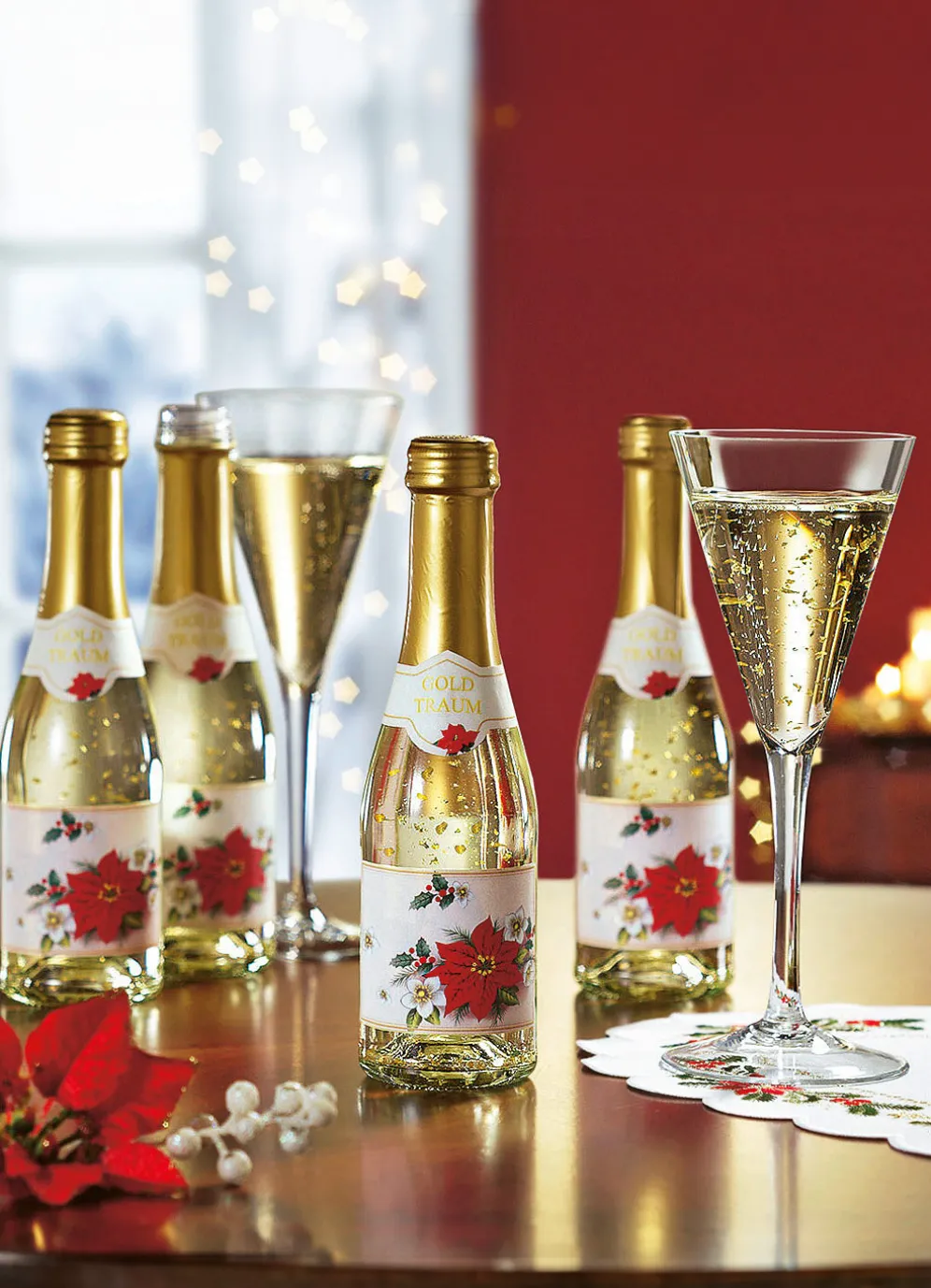 Diese Piccolos sind eine wunderschöne Geschenkidee! Prickelnd, spritziger Perlwein mit einem Hauch Weinbergpfirsichlikör und 22 Karat Blattgoldflocken (zum Verzehr geeignet). Mit schönem Weihnachtsstern- Motiv. Bestehend aus 4 Flaschen à 0,2 l (10,% Vol.).