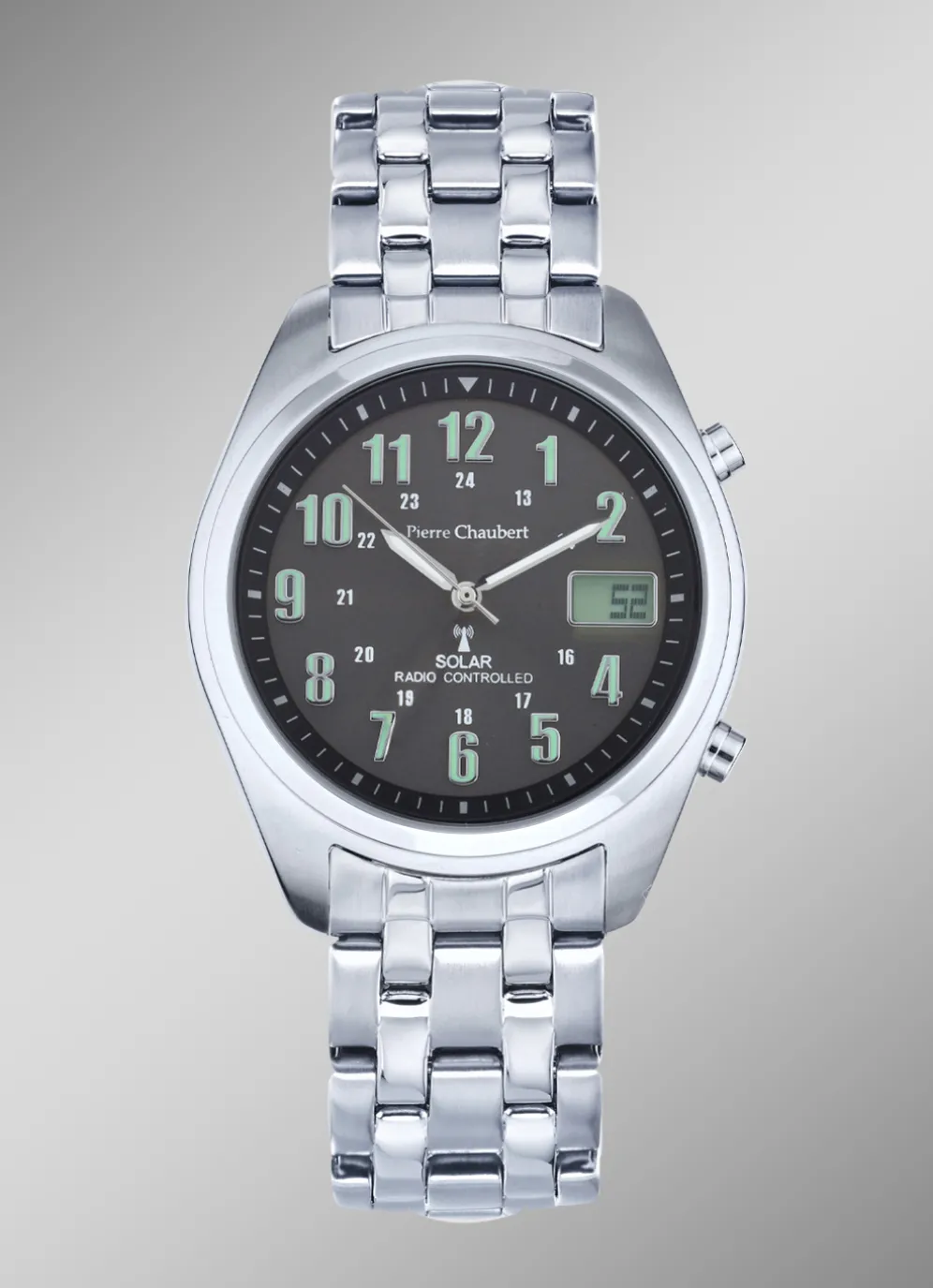 Pierre Chaubert- Funk-Solar-Herrenuhr mit Gehäuse aus Edelstahl und mit einem Uhrenband aus Edelstahl.