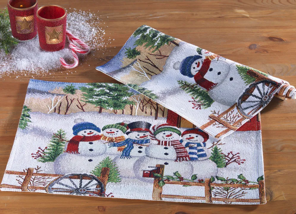 Dieses 2-teilige Platzset mit lustigen Schneemännern wird Ihnen die ganze Winterzeit hindurch große Freude bereiten. Die Qualität: Gobelin aus 65% Polyester und 35% Baumwolle. Handwäsche. Maße: je 33/46 cm