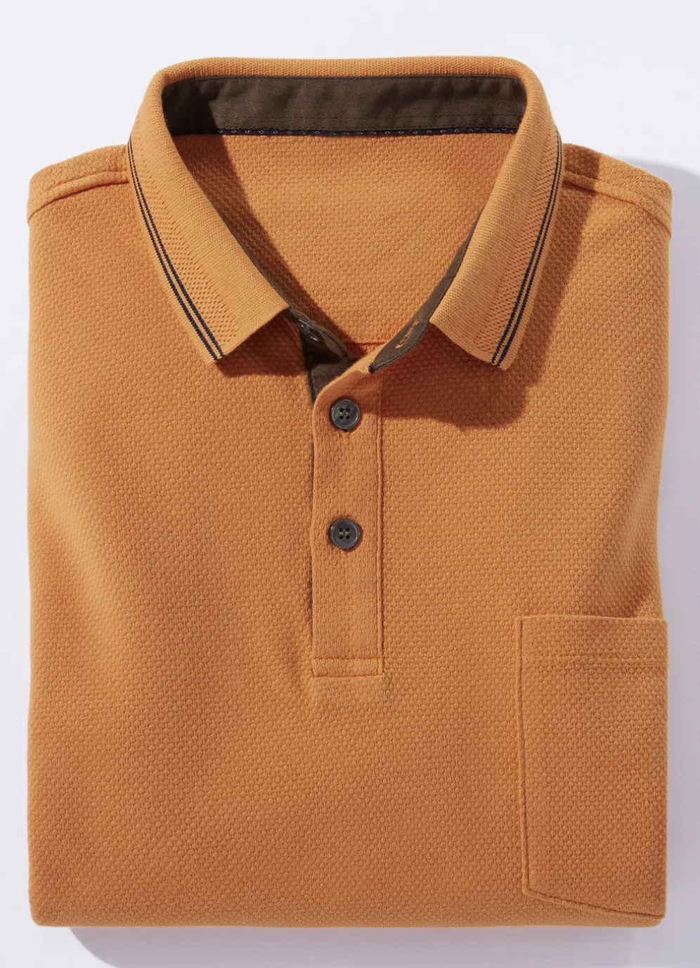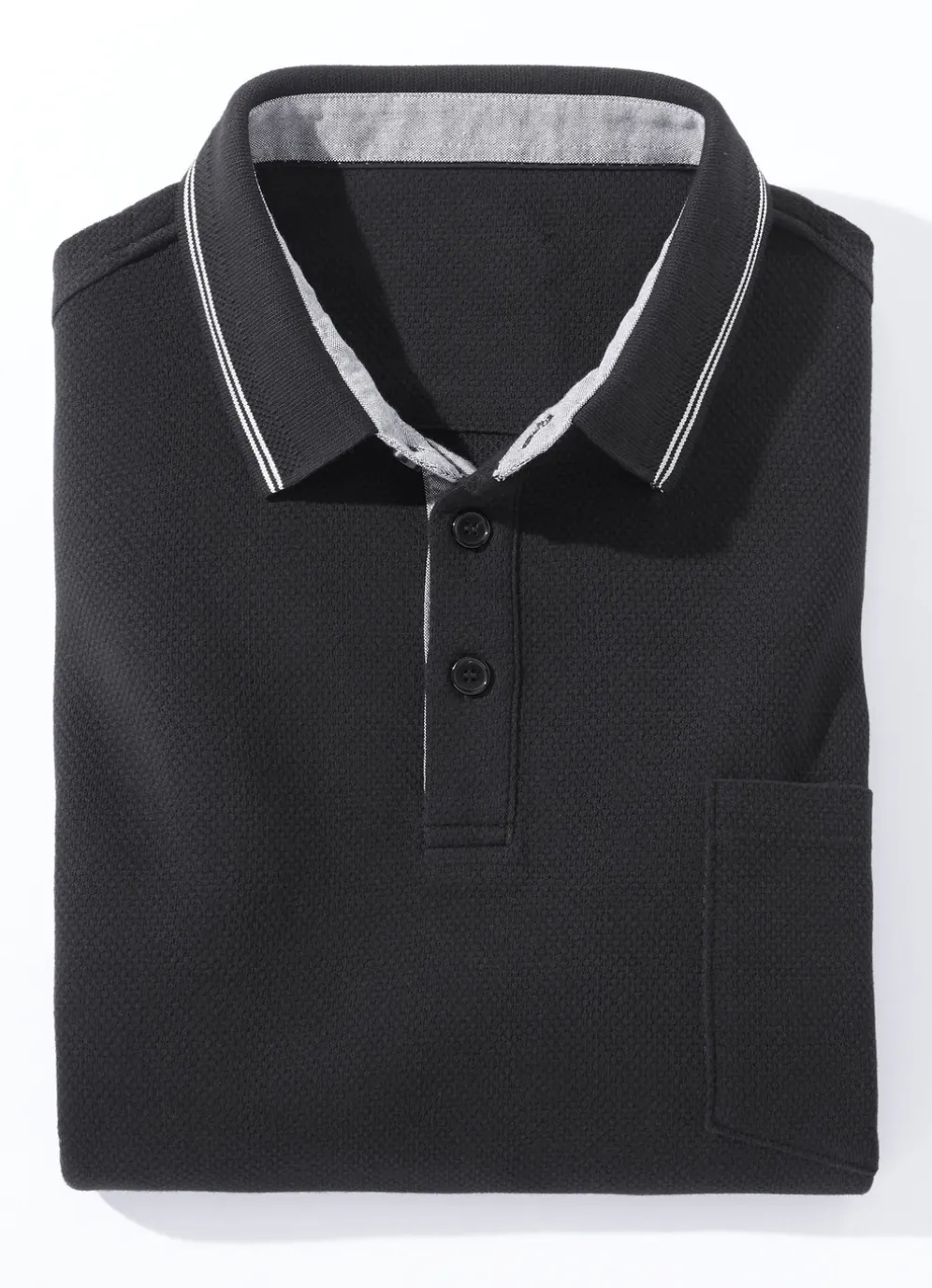 Attraktives Poloshirt mit Strickkragen, kurzer Knopfleiste, einer aufgesetzten Brusttasche links, Bündchen-Abschlüssen an den Ärmeln sowie kleinen Seitenschlitzen.