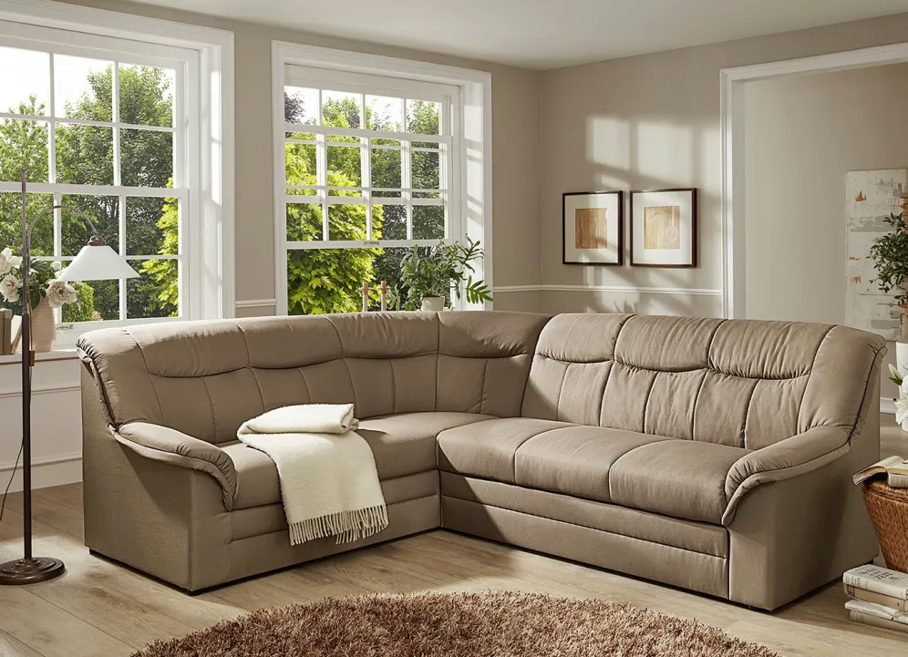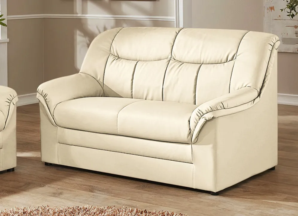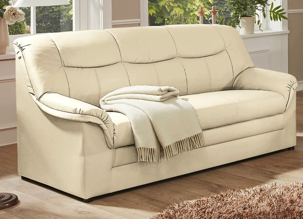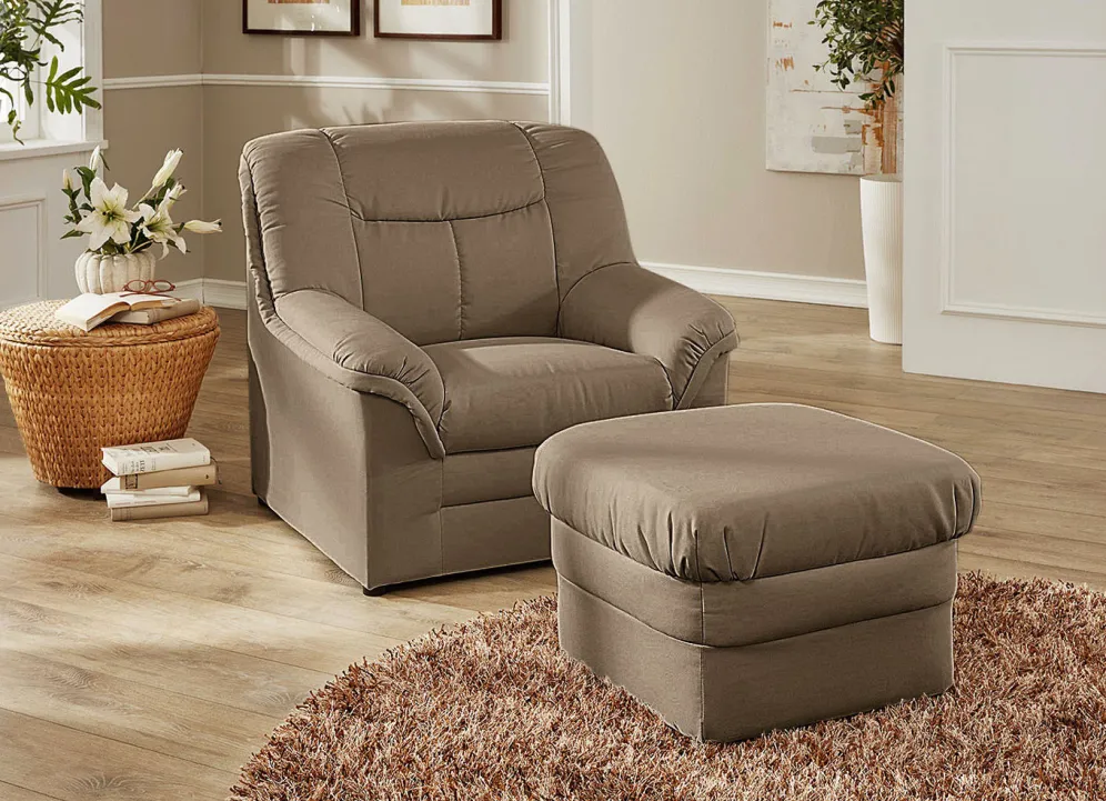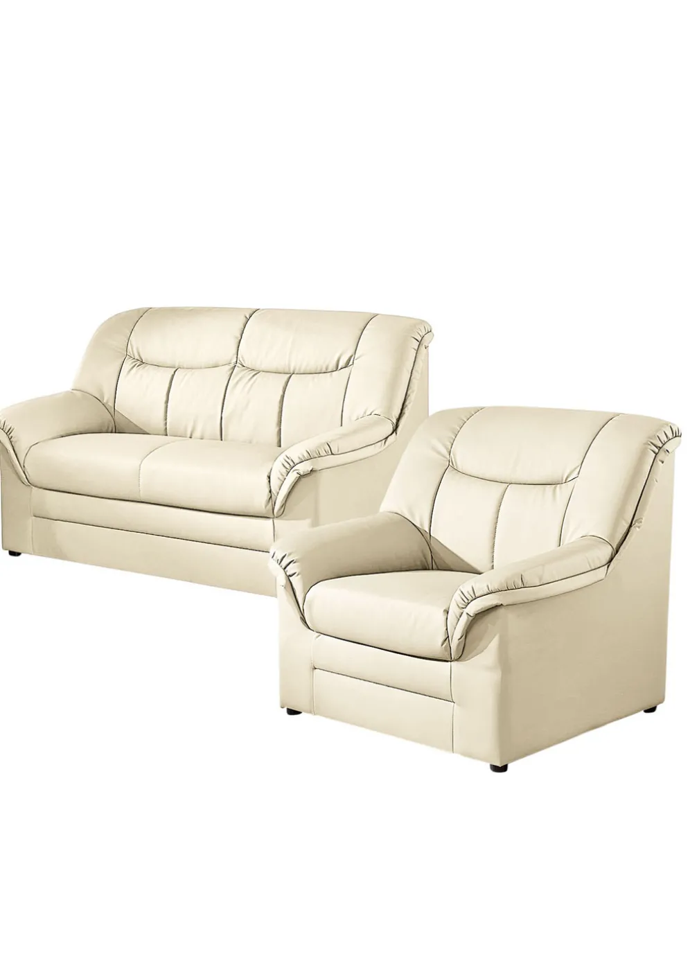 Polstermöbel auf stabilem Holzgrundgestell, mit hochwertiger, formstabiler Polyätherschaumauflage und weicher Vliesabdeckung, Sitz mit Federkern bzw. Wellenfedern sowie Elastikgurten im Rücken. Bezug mit aufwendiger, attraktiver Steppung aus Stoff in Baumwoll-Optik (100% Polyester). Die Rückseiten sind mit Originalstoff bezogen, daher frei im Raum aufstellbar. Auf Kunststofffüßen.