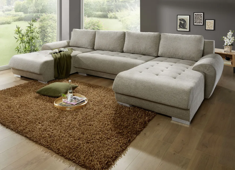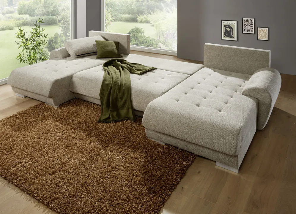 Polstermöbel mit Bettfunktion und Bettkasten in der Ausführung Polsterecke, 268×185 cm und in Beige.