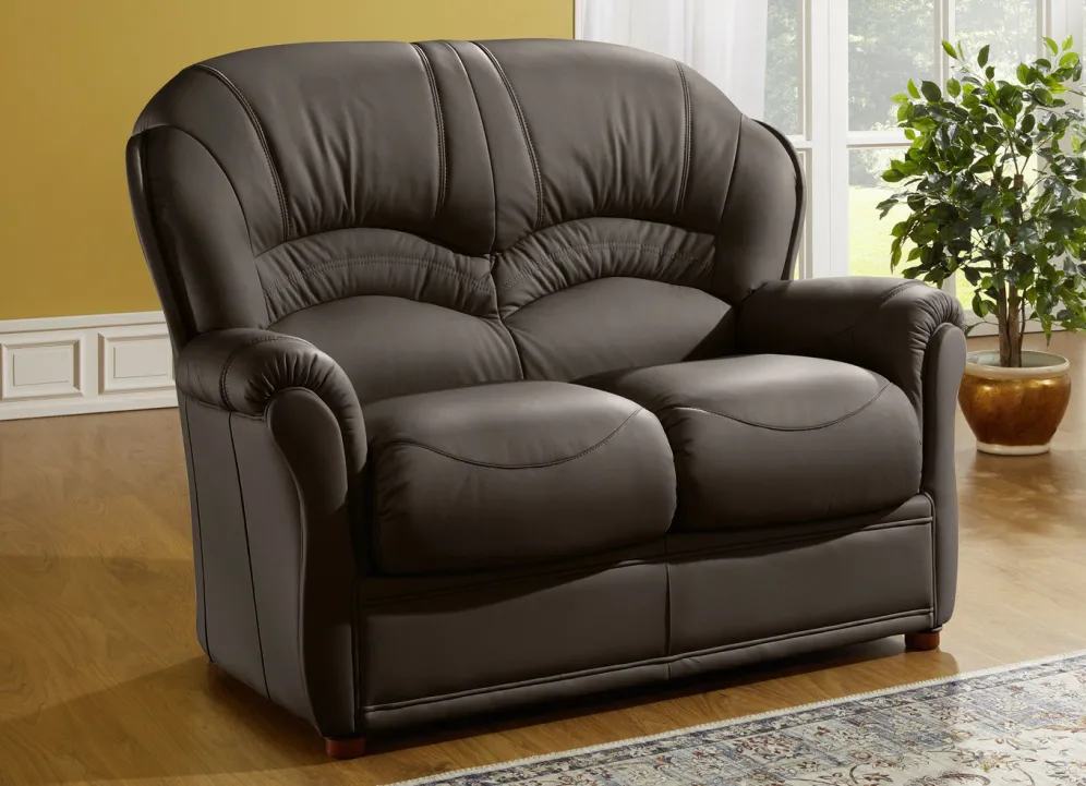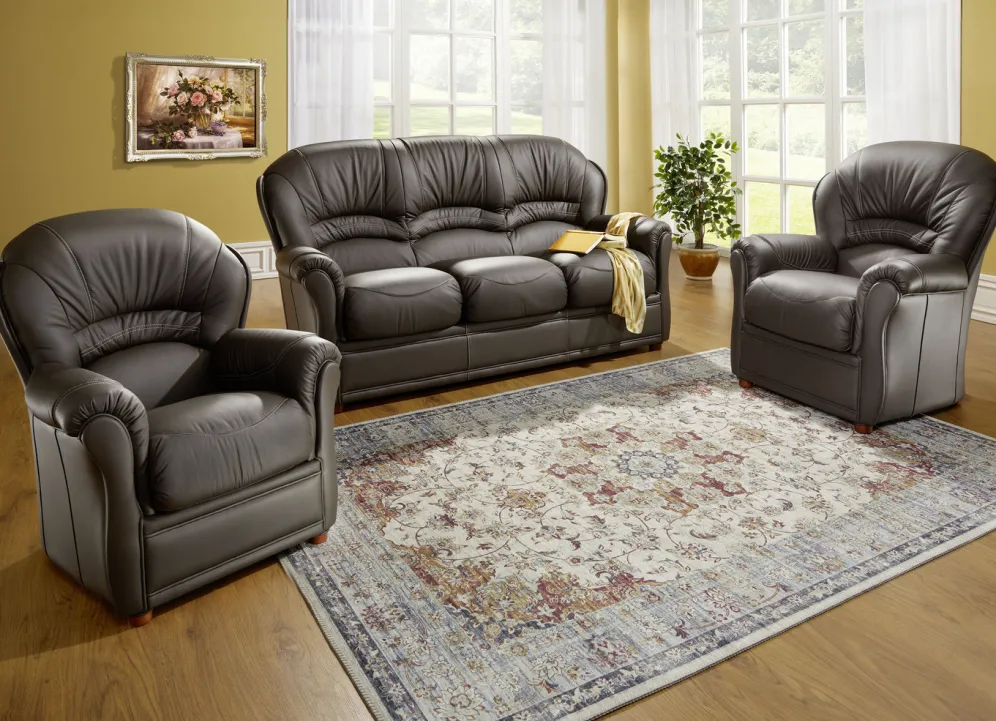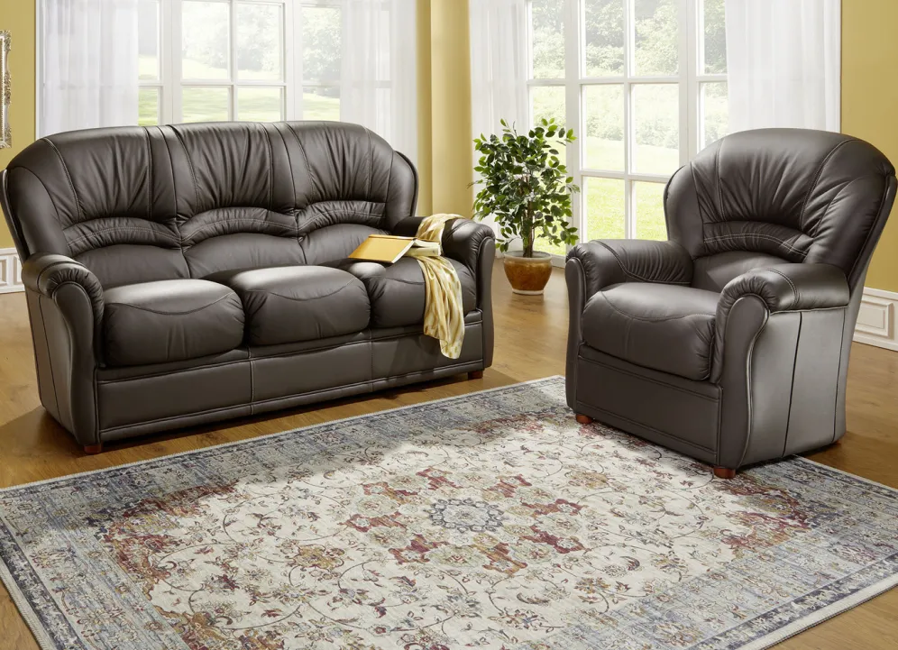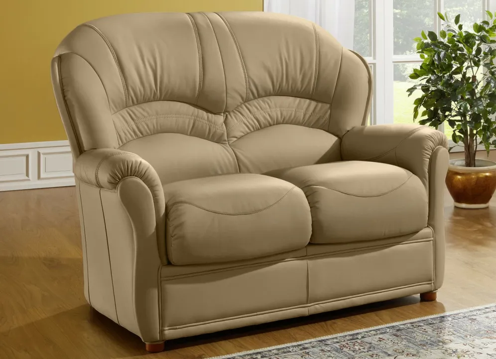 Geschmackvolle und komfortable Polstermöbel mit Bezug aus echtem Leder. Auf stabilem Holzgrundgestell, mit bequemer Polsterung sowie wertvoll gestepptem Rücken. Die Sitzkissen sind einzeln herausnehmbar. Rücken echt, daher frei im Raum aufstellbar. Maße: je Höhe 100 cm; Sitzhöhe 46 cm, Sitztiefe 48 cm
