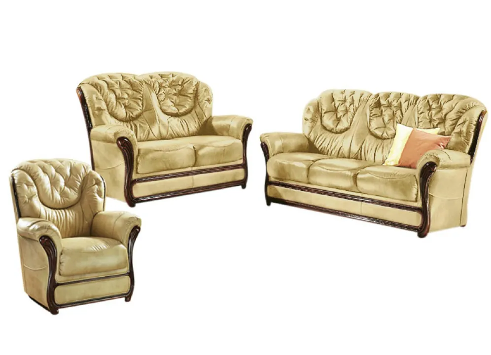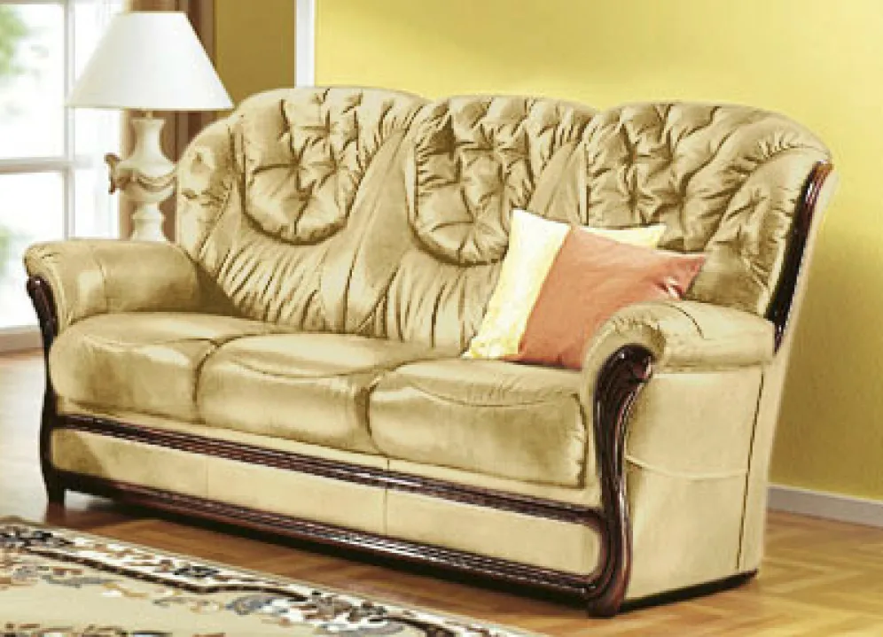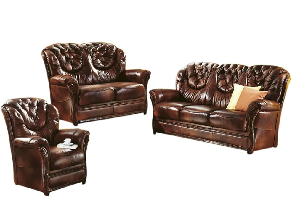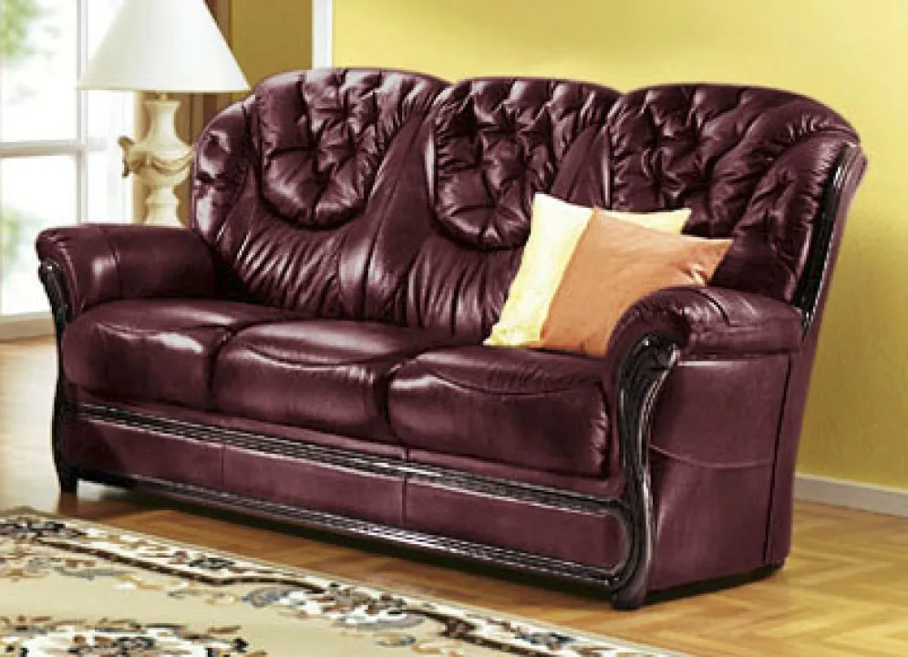 Geschmackvolle und komfortable Polstermöbel mit Bezug komplett aus echtem Leder. Auf stabilem Holzgrundgestell, mit bequemer Polsterung, wertvoll gestepptem Rücken sowie aufwendig gearbeiteten, nussbaumfarben lackierten Holz-Chatosen. Die Sitzkissen sind einzeln herausnehmbar. Rundum mit Leder bezogen, daher frei im Raum aufstellbar. Sitzhöhe 46 cm, Sitztiefe 49 cm.