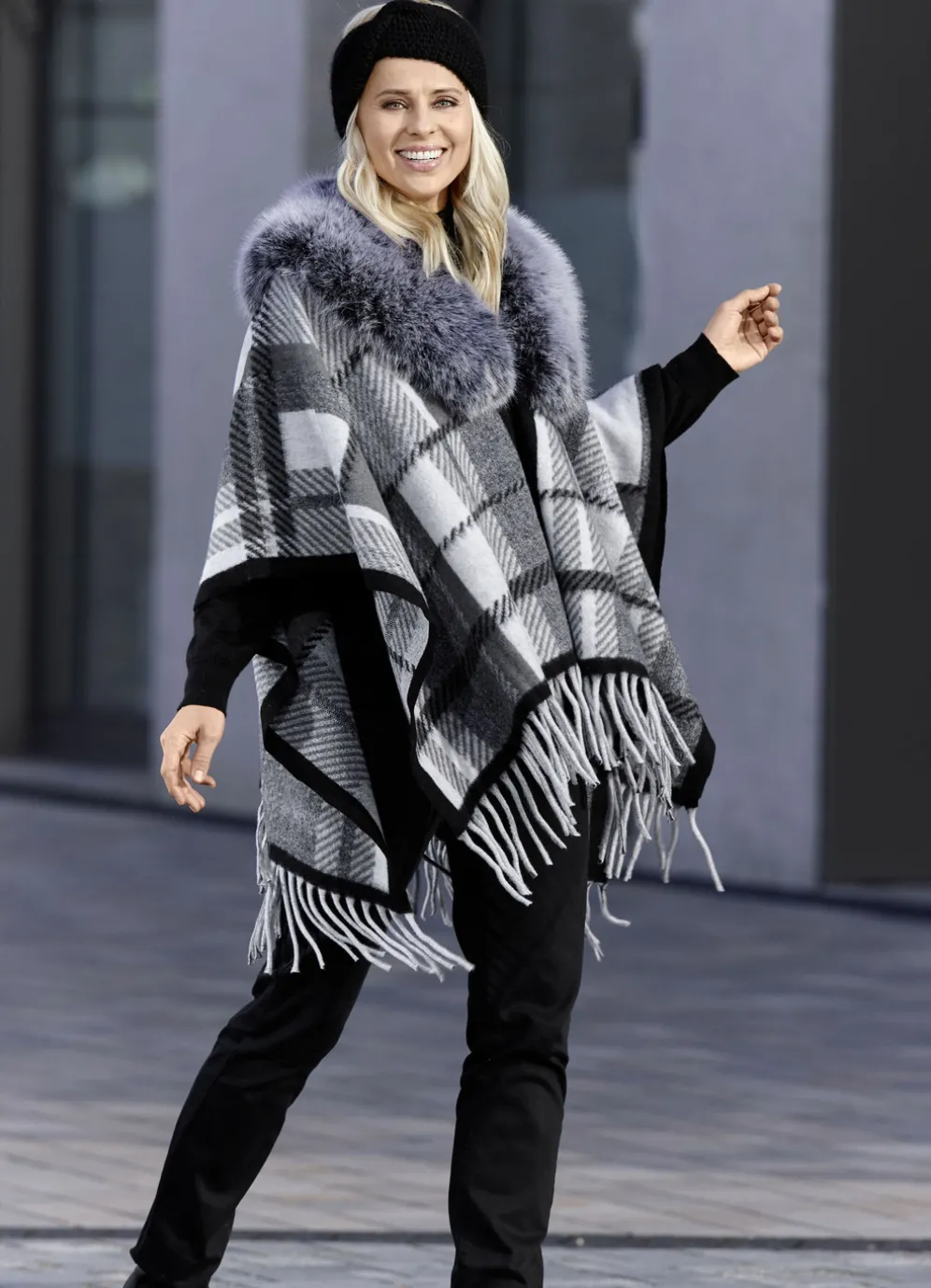 Stylisch elegant und wieder voll im Trend sind Sie in diesem Poncho mit ausdrucksstarkem Karodessin in Grau-Naturweiß-Schwarz, abnehmbarem Kunstpelz-Besatz am Kragen, Häkchenverschluss sowie Fransen am Saumabschluss. Länge ca. 65 cm. Tragbar von Gr. 36–52.