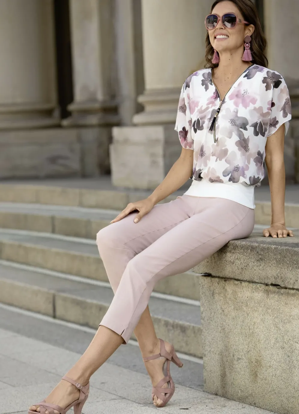 Flotte Poncho-Tunika in Ecru-Rosenholz-Taupe-Bunt, mit eingearbeitetem Top, dekorativem Schmuckanhänger am V-Ausschnitt, kurzem Reißverschluss sowie breitem Jersey-Bund rundum.
