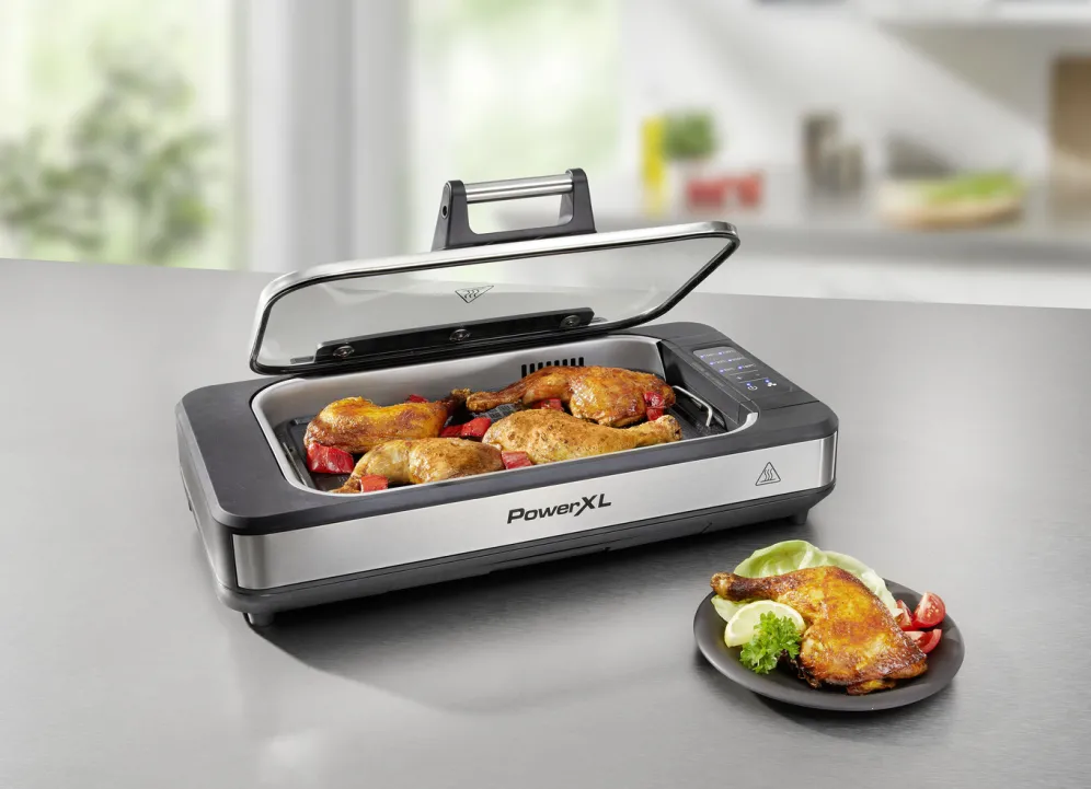 PowerXL Smokeless Grill. Der 2-in-1 Indoor-Grill verfügt über einen innovativen, integrierten Rauchabzug und Filter für ganzjährigen, wetterunabhängigen Indoor-Grillgenuss. Überschüssiges Fett tropft in die entnehmbare Abtropfwanne. Durch die extrakurze Aufheizzeit und die 6 Temperatureinstellungen von 95°C bis 230 °C wird Grillen zum absoluten Vergnügen. Peppen Sie Ihre Speisen mit einem Aromakick auf – einfach Kräuter oder Zitronenscheiben in die mitgelie¬ferte Aromaschale geben. Die Grillplatte bietet Platz für bis zu 8 Burger, 4 große Steaks oder ein ganzes Huhn. Die zusätzliche glatte Grillplatte ermöglicht die Zubereitung von Spiegeleiern, Pfannkuchen, Toast, Speck uvm. Individuell abnehmbarer oder klappbarer und selbststehender Thermo-Glasdeckel mit Silikonabdichtung ist ideal für das Dampfgaren Ihrer Speisen und sorgt für eine schonende Zubereitung. Hochwertige Anti-Haft-Beschichtung und das spülmaschinengeeignete Zubehör (alle abnehmbaren Teile) sorgen für eine einfache Reinigung. Inkl. 2 Rezeptheften. Maße: B53,5xH17xT29,6 cm, 1500 Watt