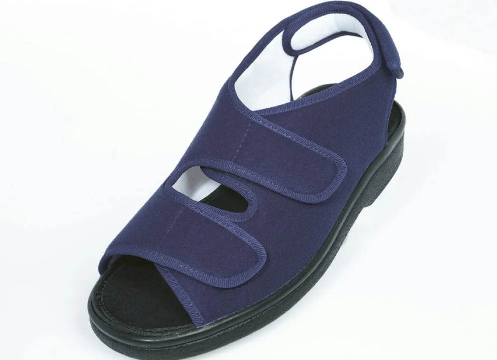 Multifunktioneller, weit zu öffnender Spezialschuh in Sandalenform mit drei Klettverschlüssen für individuelle Anpassung im Vorfuß-, Rist- und Fersenbereich. Mit offenem Fersenfenster. Besonders zu empfehlen bei Druckempfindlichkeit im Fersenbereich, aber auch bei Entzündungen und Schwellungen im Fersen- und Zehenbereich. Weite J Gr.:38-46