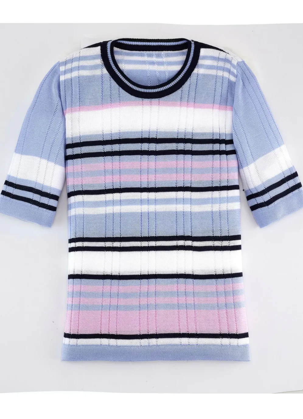 Fabelhafter Pulli mit rundem Halsausschnitt, Ringeldessin und streckenden Ajourakzenten allover sowie kurzen Ärmeln.