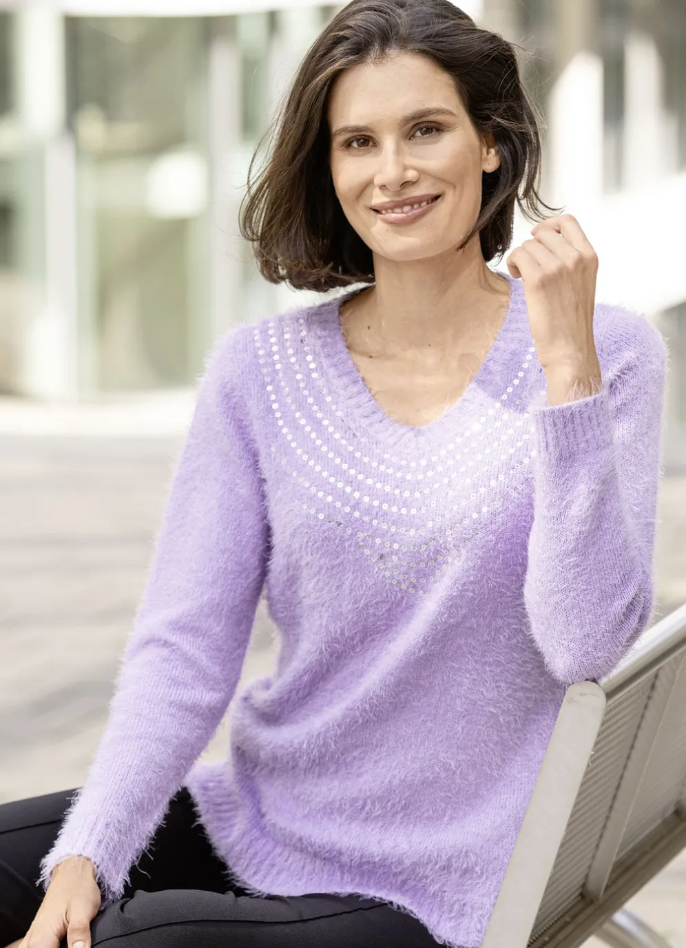 Ein Hingucker ist dieser schöne Pullover mit edler Paillettenzier entlang des V-Ausschnitts, superweichem haarigem Effektgarn, langen Ärmeln und Saum mit Rippenbund.