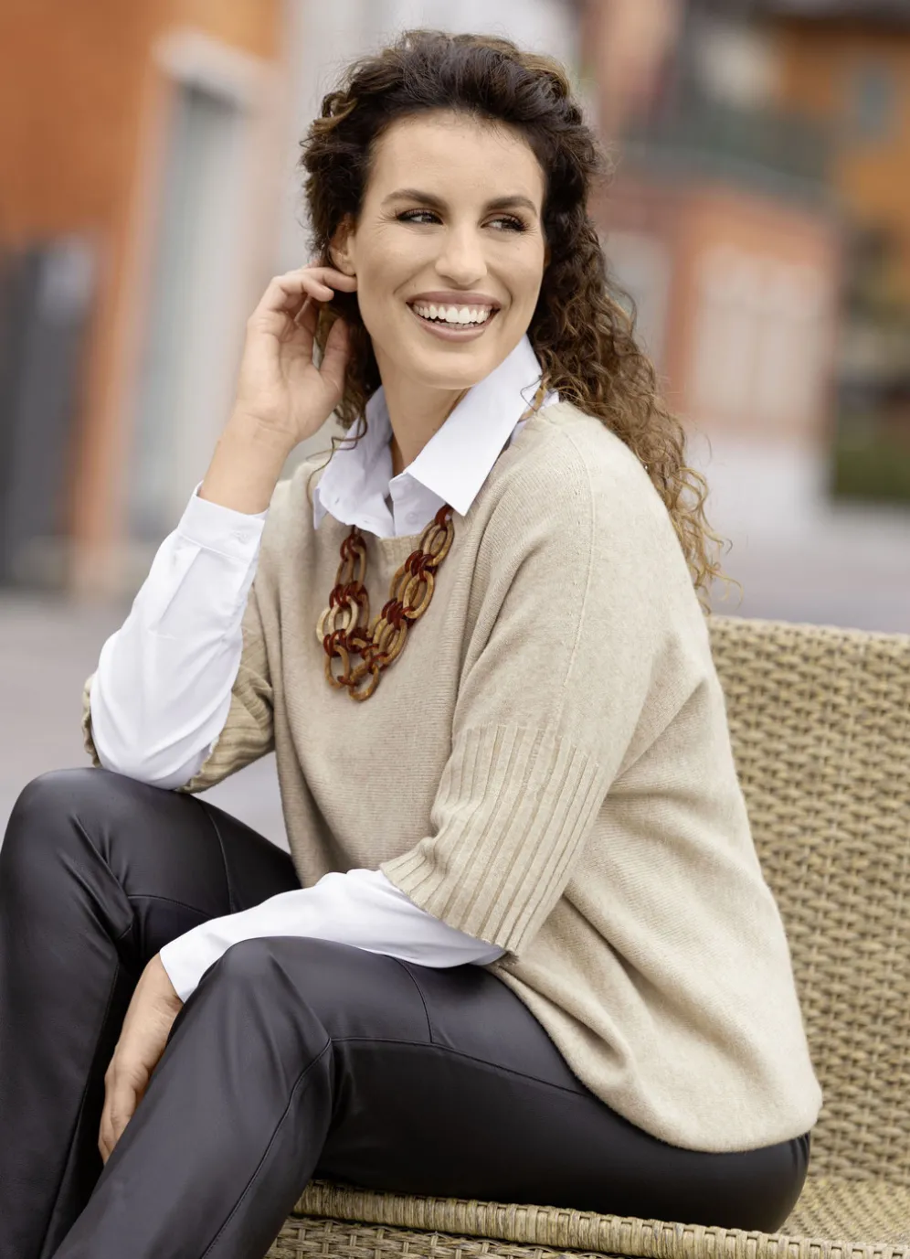 Ein ideales Kombimodell ist dieser beige melierte Pullover, der mit und ohne Bluse zu tragen ist: weiter, runder Halsausschnitt, quergestrickt, Fledermausärmel in modischer Länge mit gerippten Abschlüssen sowie nach innen rollierter Saum.