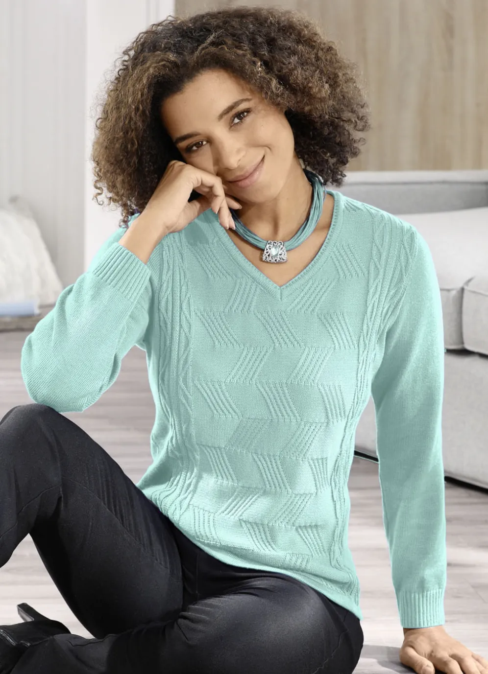Unverzichtbar und super zu kombinieren ist dieser hübsche Pullover: V-Ausschnitt mit feinem Ajourdessin, streckender, aufwendiger Strukturmix im Vorderteil sowie lange Ärmel mit Rippenbündchen.