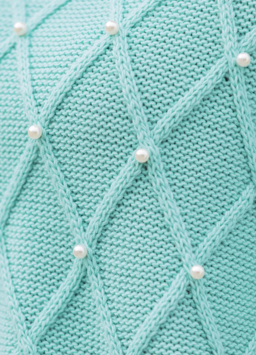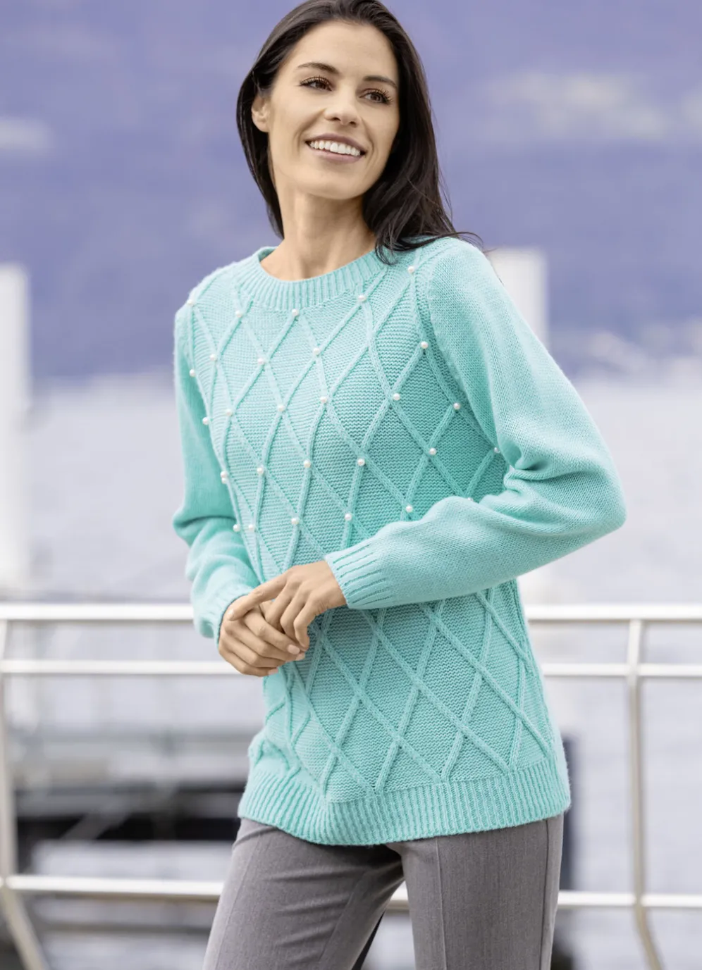 Bezaubernder Pullover mit weitem, rundem Halsausschnitt, Strukturmuster im Rautendessin und Perlenzier im Vorderteil, langen Ärmeln und Rückteil rechts gestrickt sowie gerippten Abschlüssen.