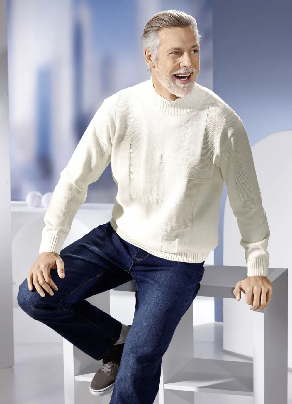 Das Besondere an diesem schicken, unifarbenen Pullover ist das attraktive Strukturdessin allover. Mit Stehkragen und Rippenstrick-Abschlüssen.