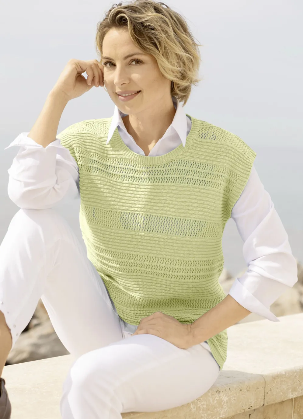 Raffinierter Pullunder mit Ajour- und Stukturmix allover, rundem Halsausschnitt sowie gerippten Abschlüssen.