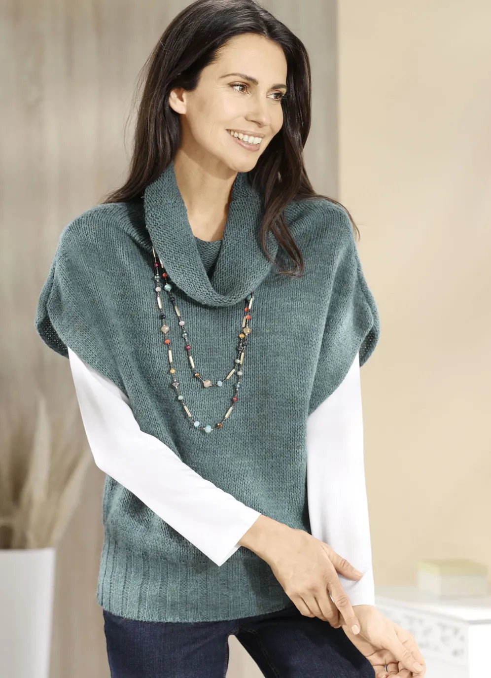 Der ideale Kombibegleiter ist dieser hochwertige Pullunder in überschnittener Form, mit weitem Rollkragen sowie Rippenstrickabschluss am Saum.