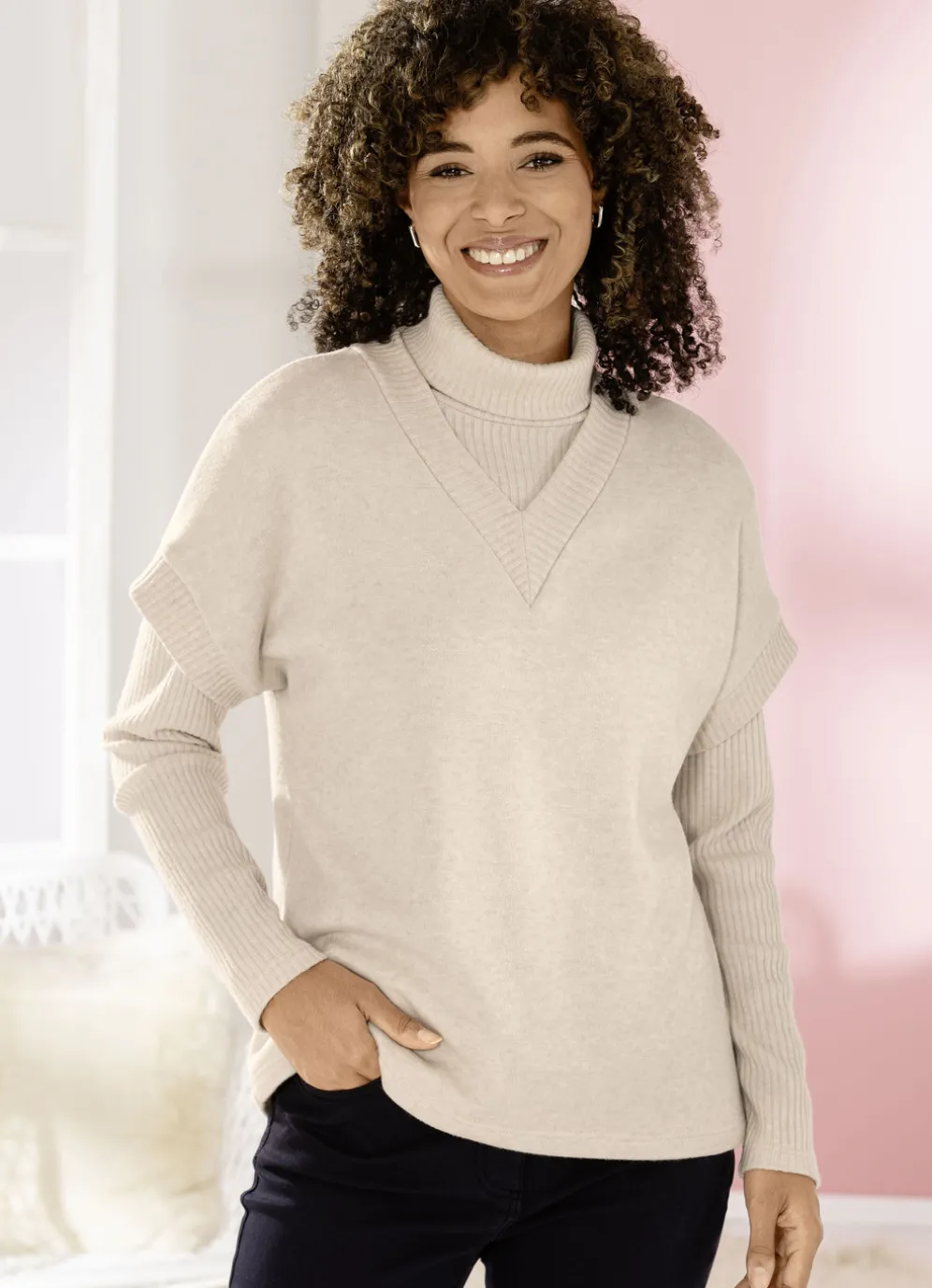 Setzen Sie einen Akzent mit diesem Pullunder in überschnittener Form, mit Rippenabschlüssen am V-Ausschnitt und an den kurzen Ärmeln.