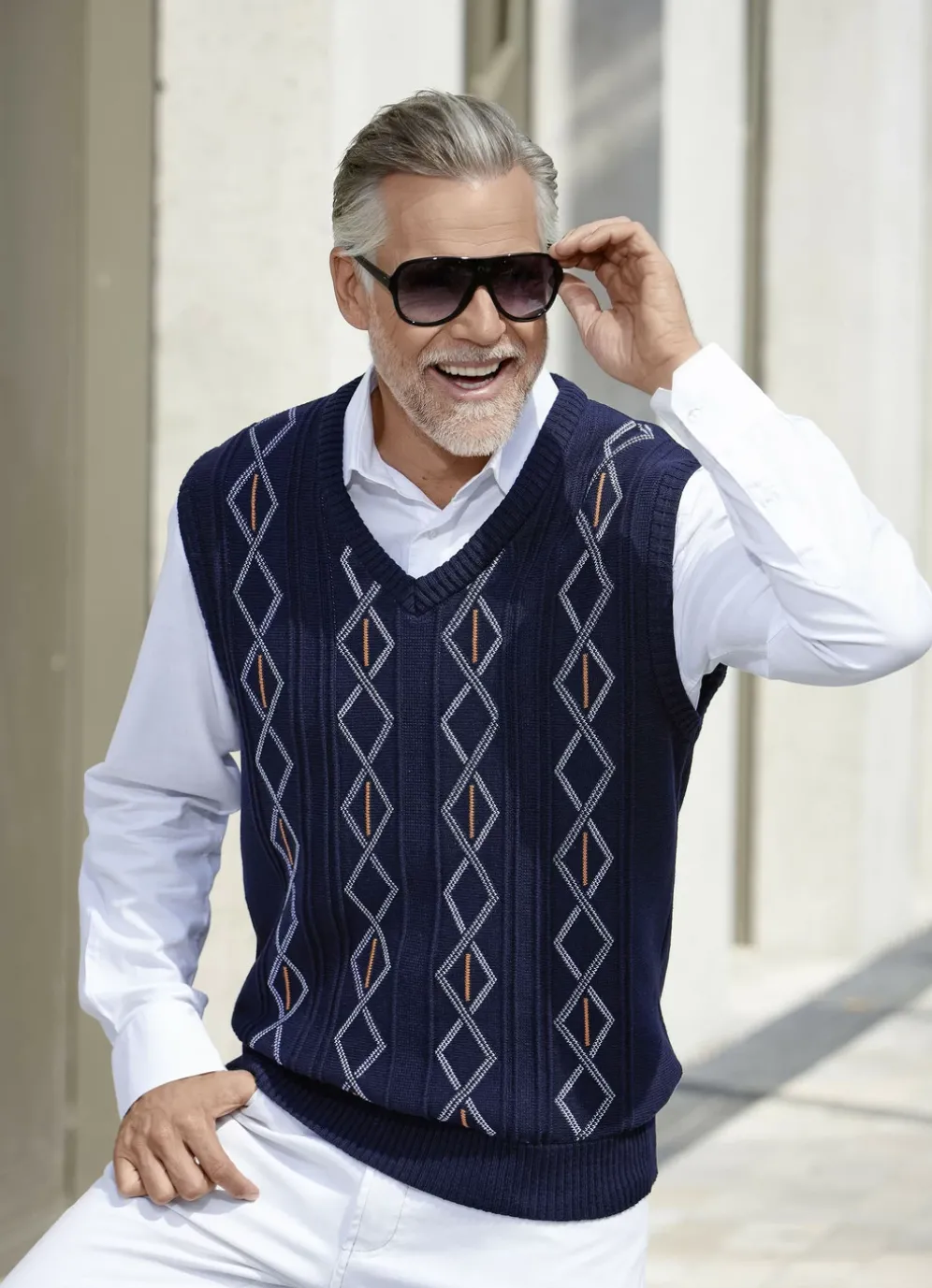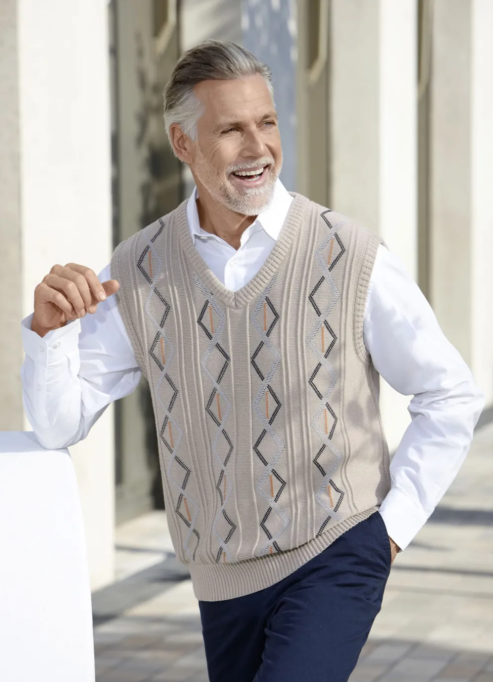 Mit viel Chic präsentiert sich dieser herrliche Pullunder mit V-Ausschnitt, Strukturmuster im Vorderteil sowie Rippenstrick-Abschlüssen.