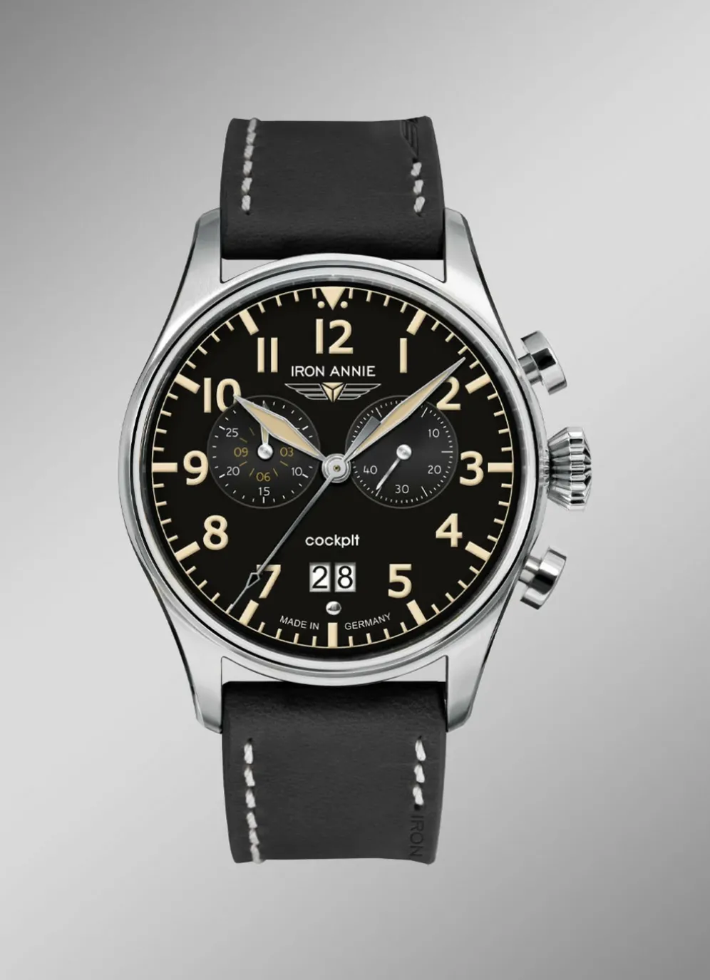 Dieser sportliche Quartz-Chronograph der neuen Serie „Iron Annie Cockpit“, aus dem Hause POINT tec Electronic GmbH, soll an die immer noch flugfähige Maschine mit dem Kennzeichen D-AQUI erinnern, die liebevoll Iron Annie genannt wird.