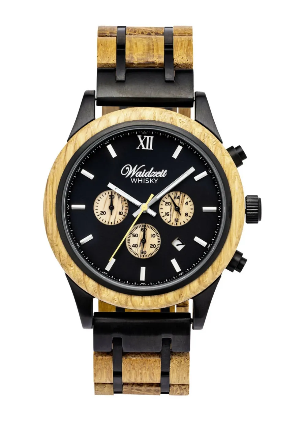 Unser Whisky Chronograph Scotts Highland erinnert mit seiner erdigen Farbgebung an die Moore der schottischen Hochlands. Der occerfarberne Sekundenzeiger ist dem Farbton des Whiskys nachempfunden. Der Waidzeit Chronograph besticht durch zahlreiche Raffinessen wie Stoppfunktion, kleine Sekunde und Datumsanzeige. Zudem wurde das Holz, das zur Herstellung der Uhr verwendet wird, aus recycelten Whiskyfässern gefertigt. Ursprünglich wurde das Whiskyfass für die Lagerung weltbekannter Whiskysorten verwendet – ein Designprodukt mit Geschichte! Nun erfährt es ganz neue Verwendung – die aufwendige Verarbeitung zu individuellen Armbanduhren aus Eichenfass. Jede Whiskyuhr ist ein Unikat und hat eine spezielle Maserung und Struktur.