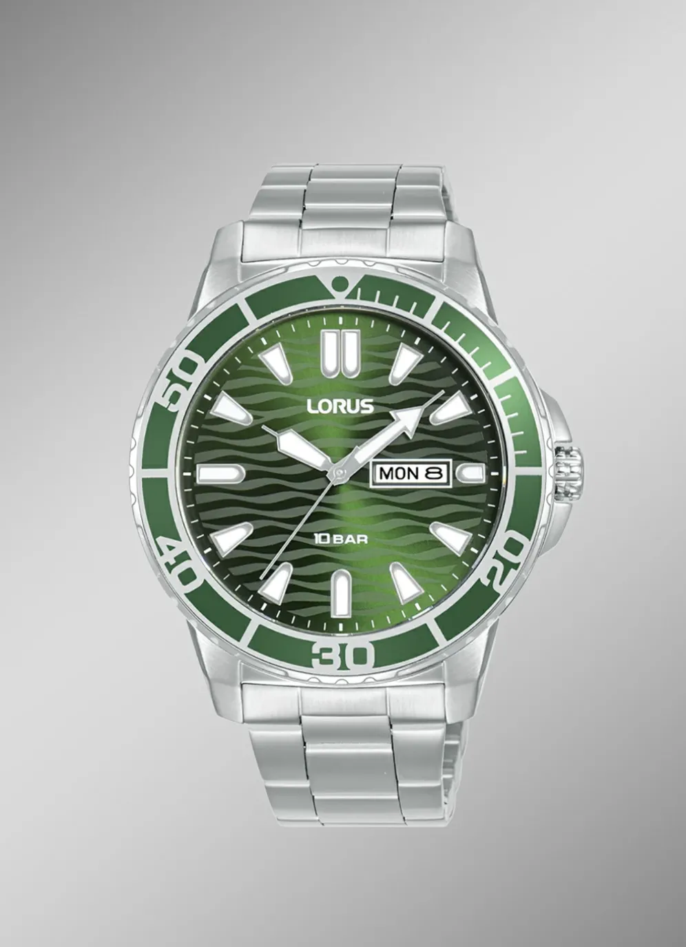 Sportliche Quartz-Herrenuhr der Marke Lorus. Die Herrenuhr hat ein Edelstahlbandgehäuse mit Sicherheitsfaltschließe und Mineralglas. Durch die vorhandenen Leuchtzeiger kann die Uhrzeit im Dunkeln besser abgelesen werden. Zudem gibt es eine Datums- und Tagesanzeige und einen verschraubten Gehäuseboden. Die Herrenuhr ist 10 bar wasserdicht und hat einen Gehäusedurchmesser von 42 mm.