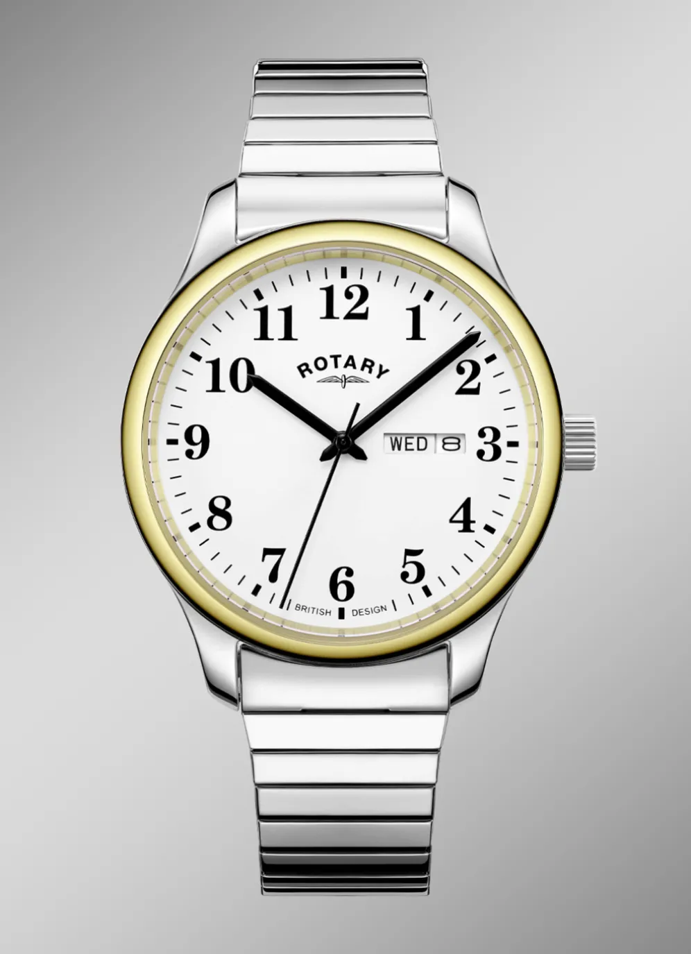 Diese Herrenuhr ist auf Komfort und Leichtigkeit ausgelegt. Das Zugband passt sich jeder Handgelenkgröße an und erfordert keine Anpassung. Das 38-mm-Edelstahlgehäuse mit goldfarbener Lünette verfügt über ein minimalistisches, klares weißes Zifferblatt mit arabischen Ziffern und Tag-/Datumsfenster bei 3 Uhr.