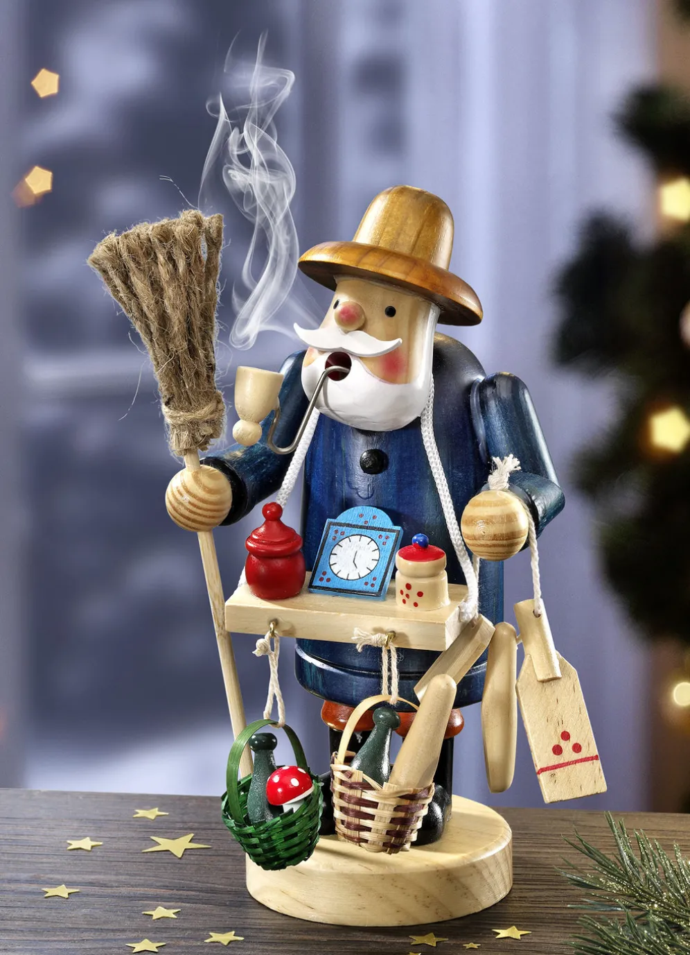 Dieses liebevoll gestaltete Räuchermännchen aus Holz hat einen Bauchladen voller Haushaltswaren sowie einen Besen dabei um hausieren zu gehen. Die Lieferung erfolgt ohne Räucherkerzen. Handbemalt. Maße: B10xH19xT10 cm