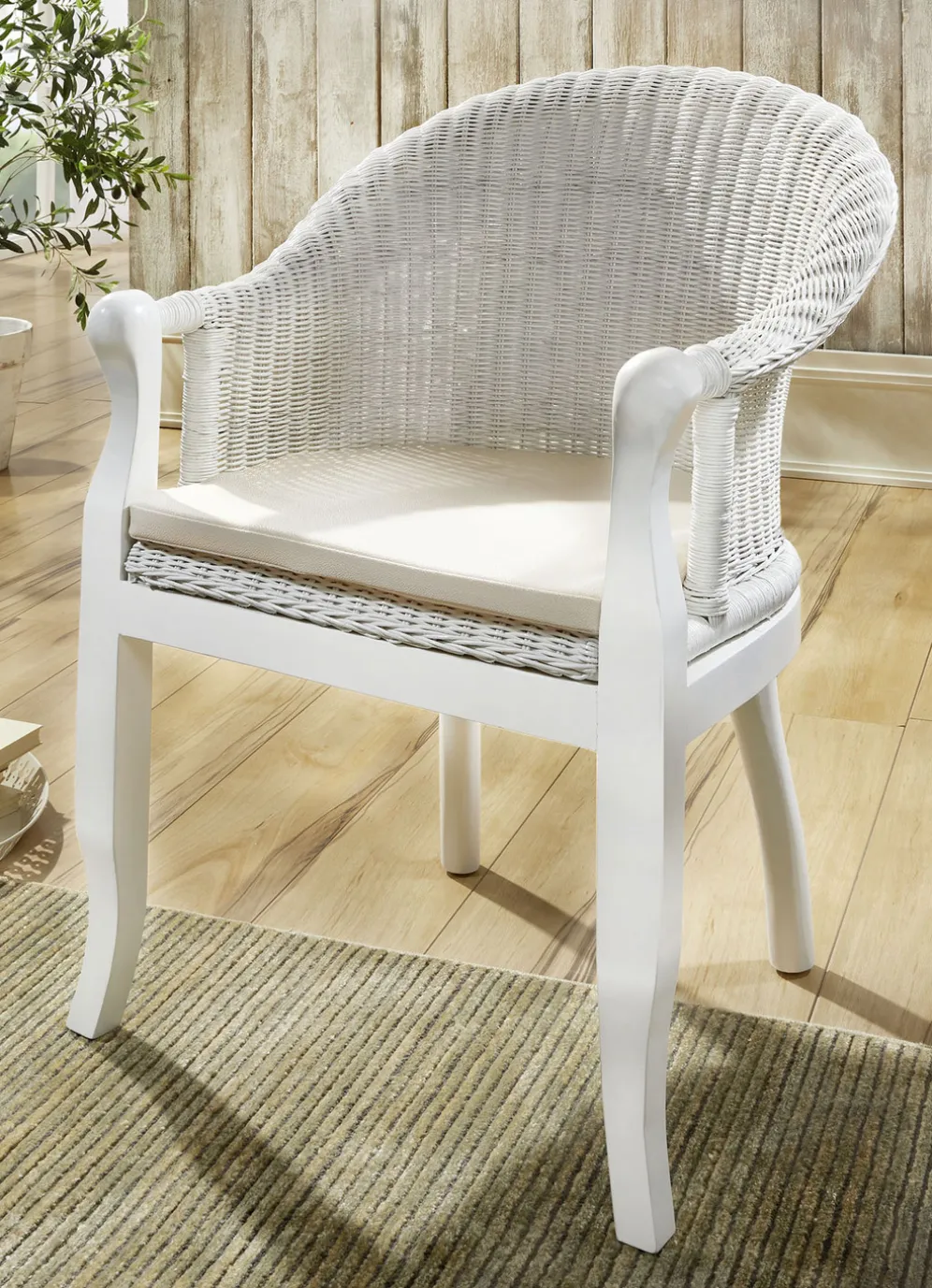 Rattansessel auf massivem Pinienholz in Weiss.