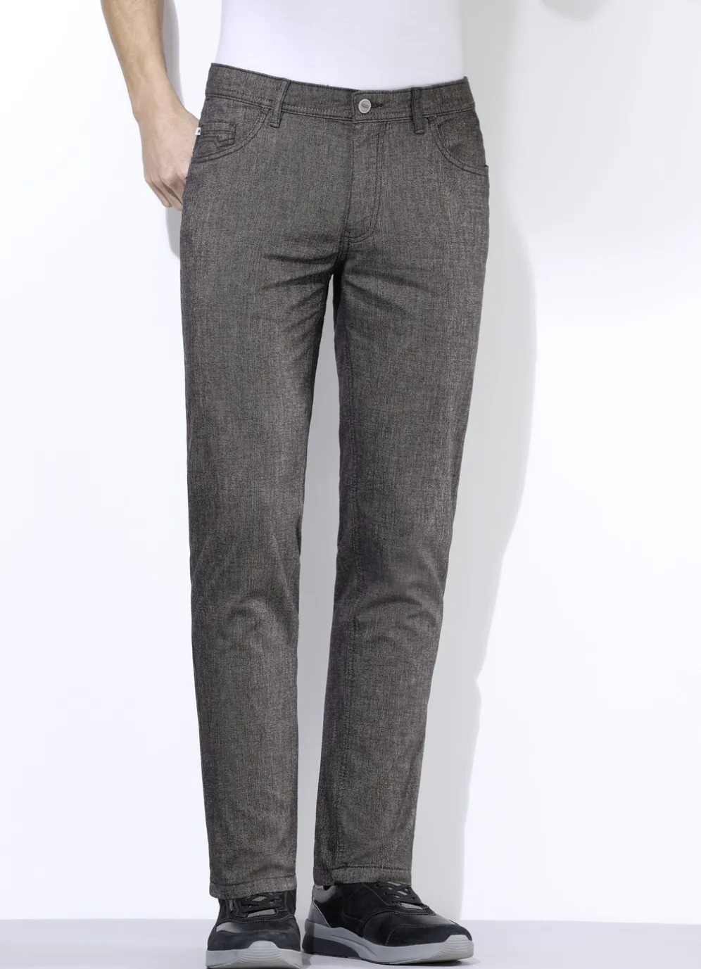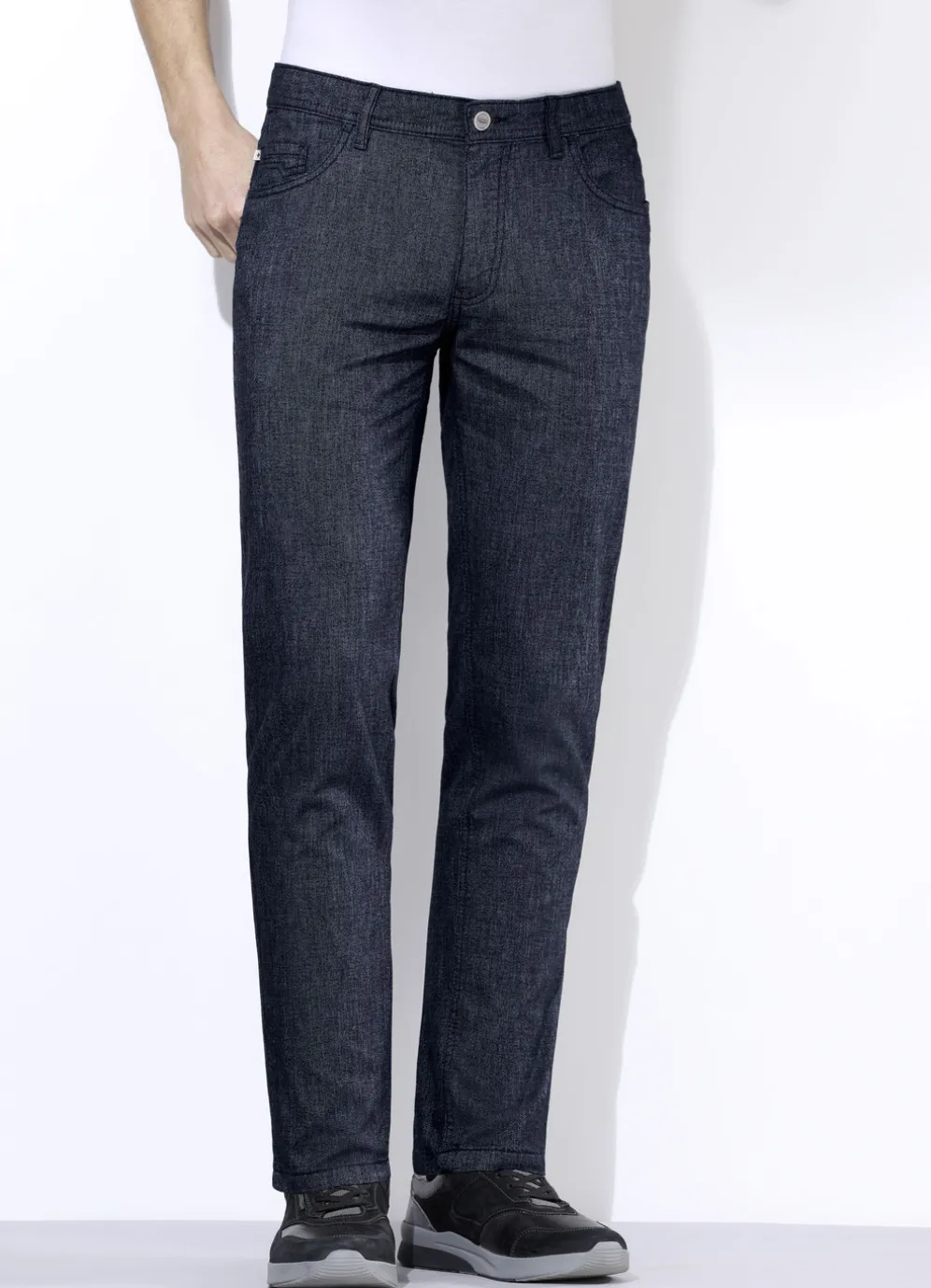 Raffinierte „Redpoint“-5-Pocket-Hose in Wolloptik: Seitentaschen mit Nietenzier, Jeanssattel, aufgesetzte Gesäßtaschen mit Ziersteppung sowie Kleingeldtasche.