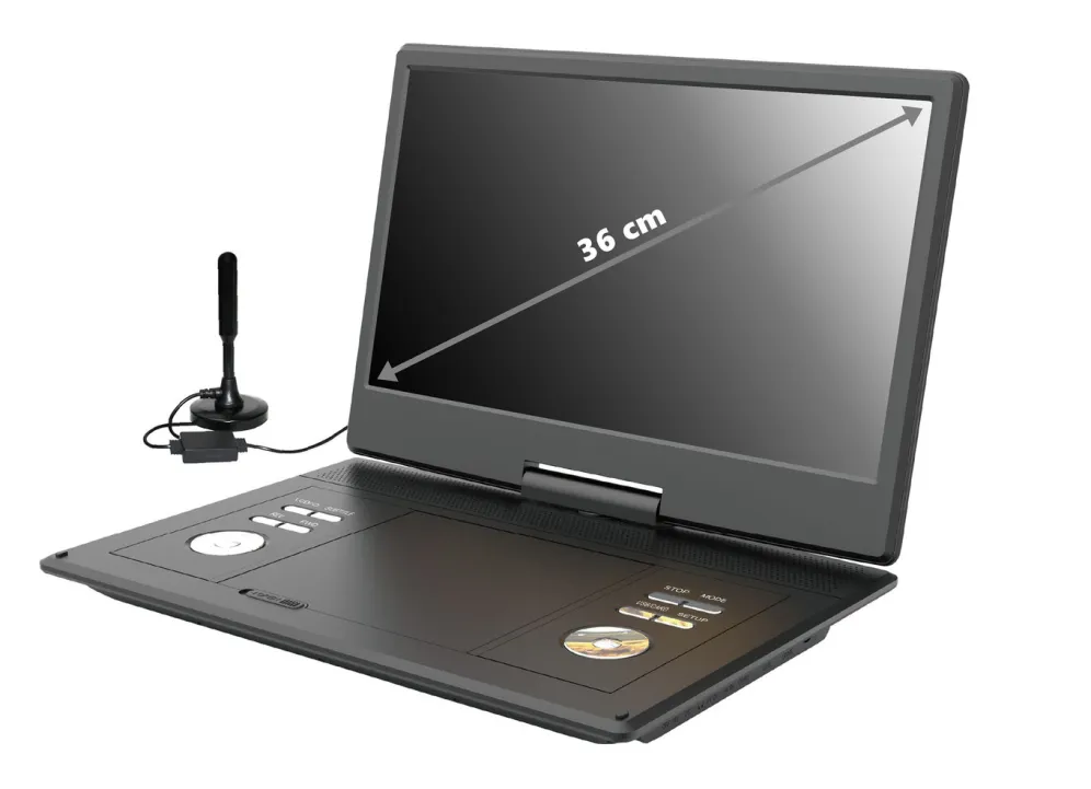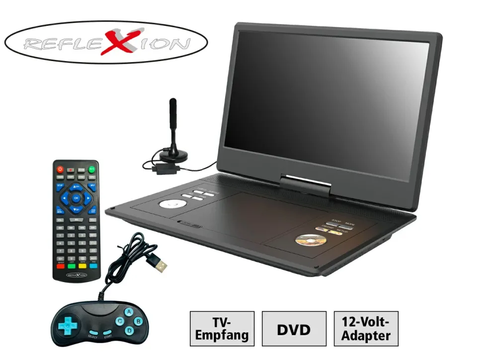 Reflexion DVD 1424. Mit diesem portablen DVD-Spieler können Sie sich Ihre Filme immer und überall ansehen. Mit DVB-T2-HD-Antenne für zusätzlichen TV-Empfang. Spielfunktion inkl. Game-Disk mit 300 Spielen & Gamepad. Drehbarer 14“ (35,6 cm) TFT/LCD-Bildschirm. Auflösung 1366x768p. Abspielen von DVD, DVD-R/RW, CD, CD-R/RW und JPEG. Antischock-Funktion, integrierte Stereo-Lautsprecher. Akkulaufzeit ca. 3 Stunden.