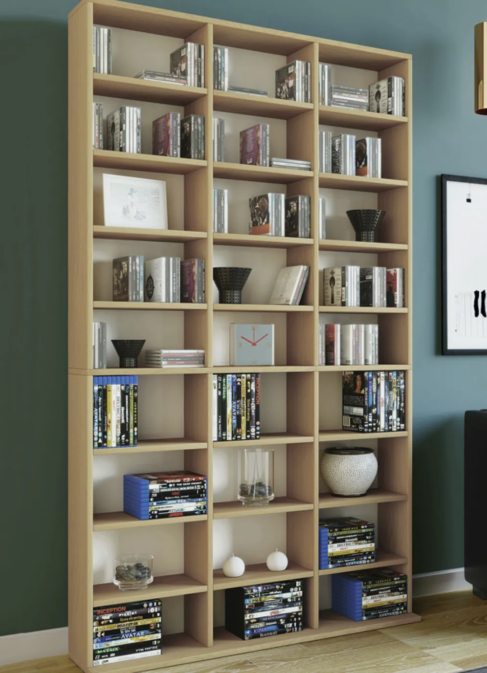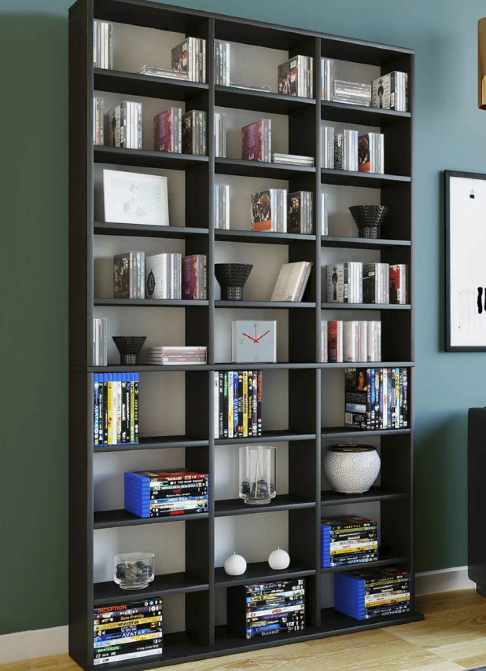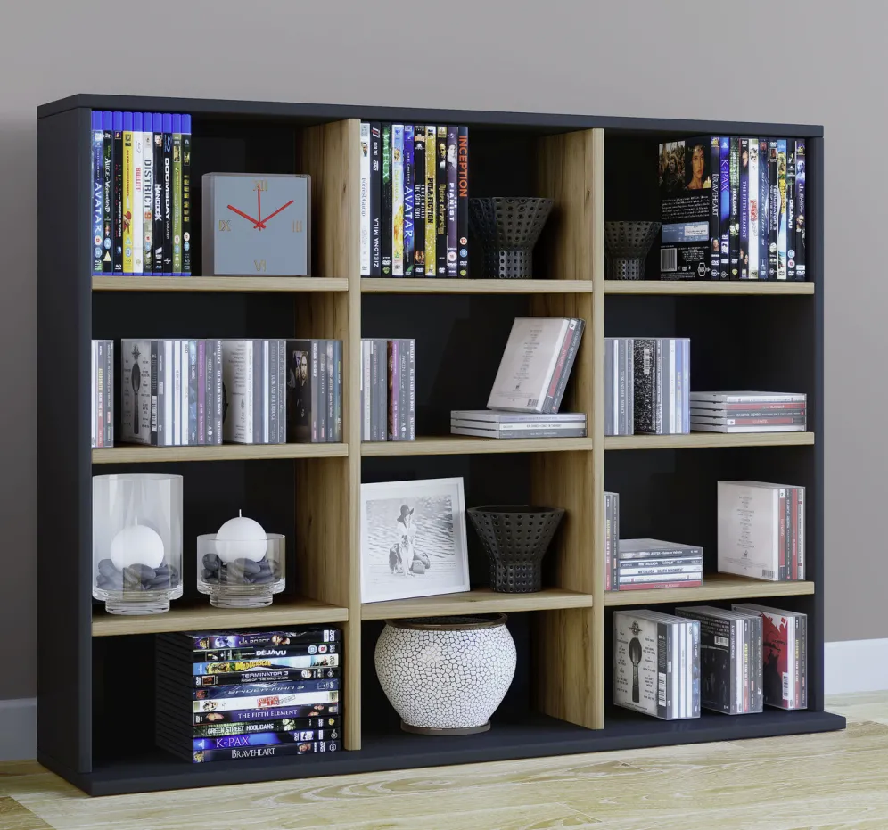 Dieses robuste und äußerst praktische Regal bietet ausreichend Archivierungsmöglichkeiten für CDs, DVDs, Videos und viele weitere Sammelschätze. Der Korpus besteht aus einer Holzstruktur- Nachbildung. Das Standregal eignet sich auch perfekt als Raumteiler für jeden Wohnbereich. Mit Aufbau-Anleitung
