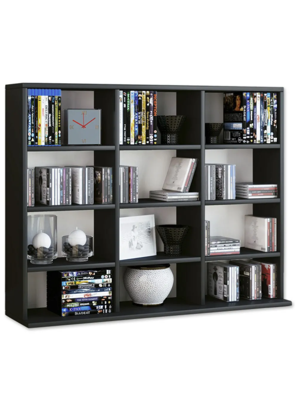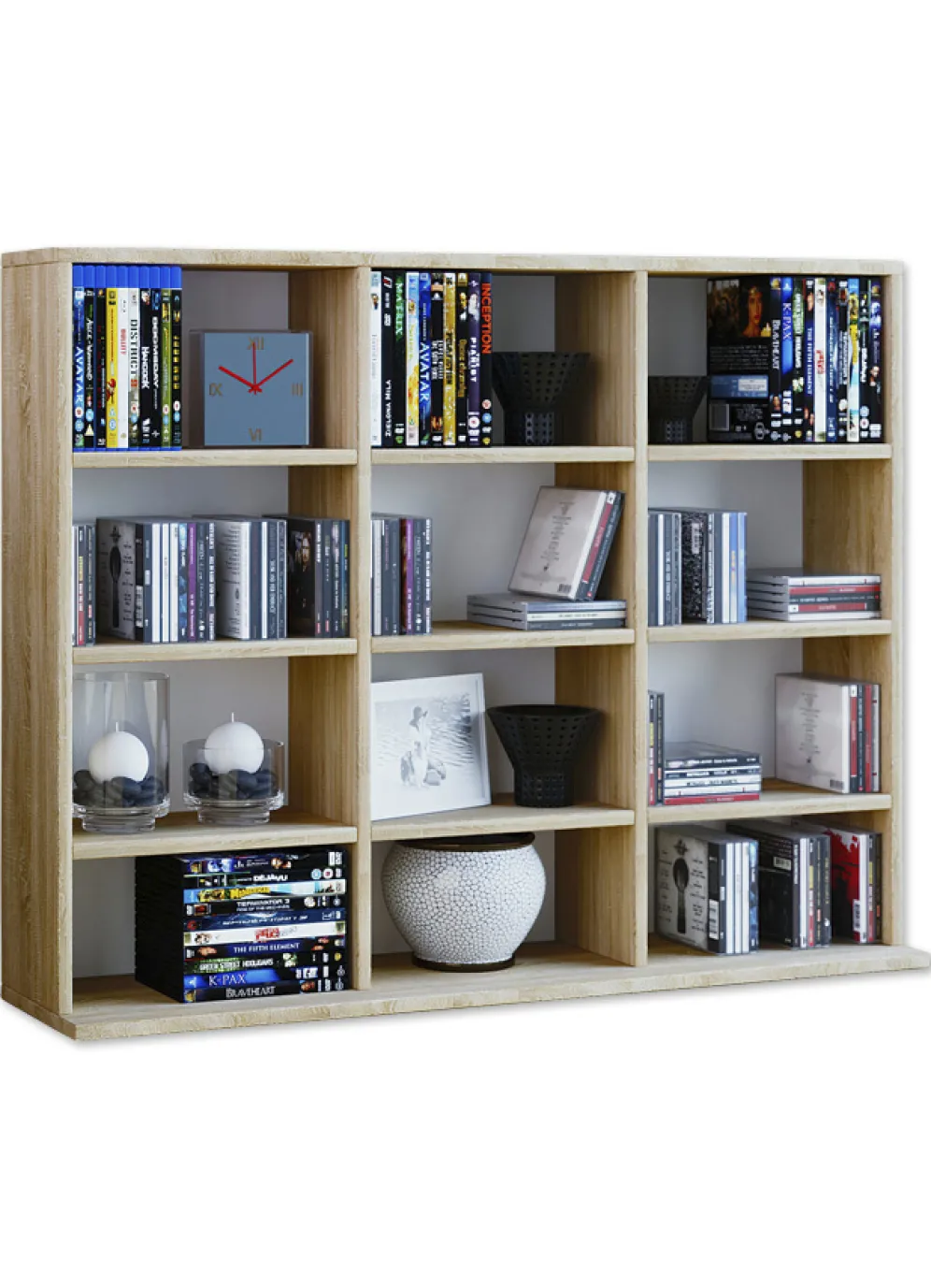 Regal, klein: Mit 12 offenen Fächern (9 Einlegeböden, höhenverstellbar). Bietet Platz für 480 CDs oder 224 DVDs. Maße: B102xH83xT23 cm