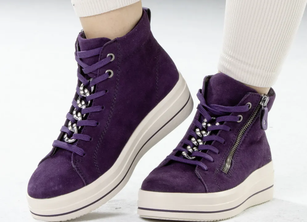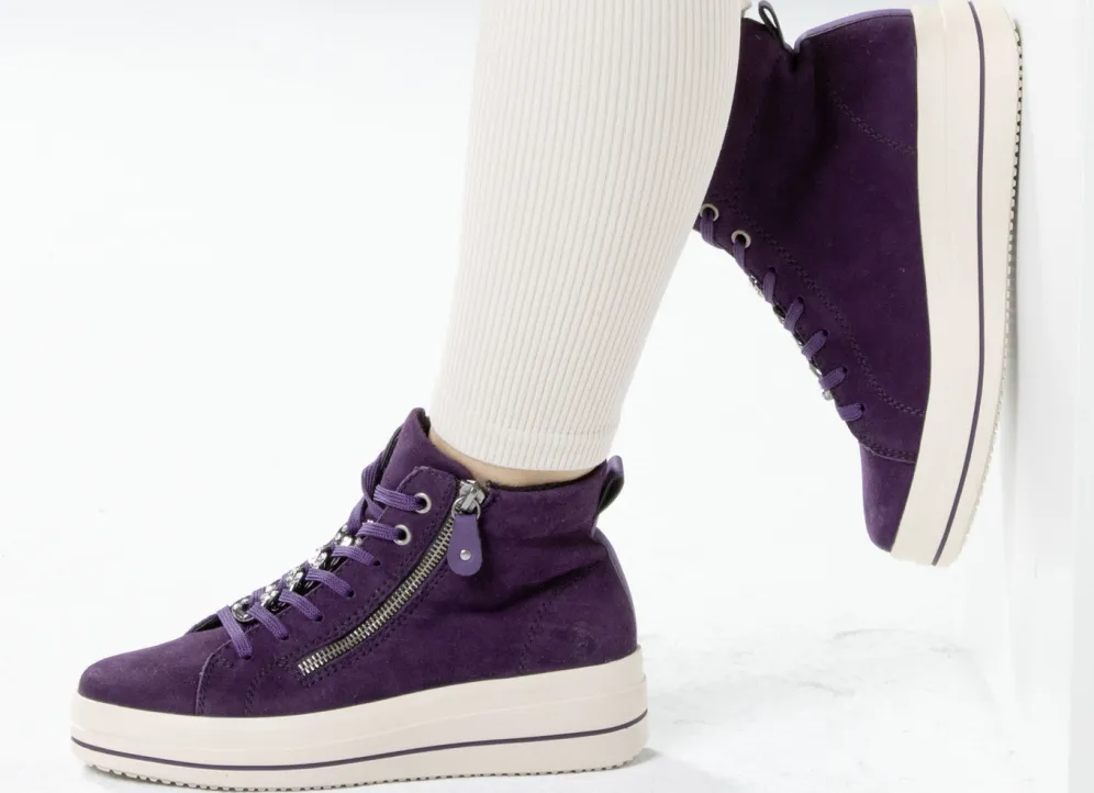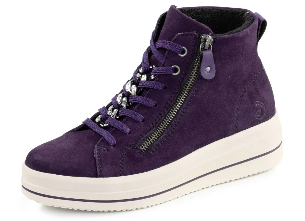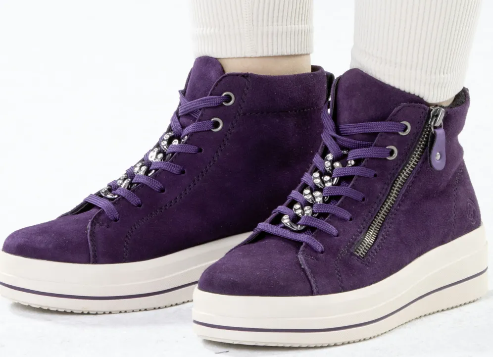 Remonte Bootie mit funkelnder Zierkette an der Schnürung in Lila und in Größe 36.