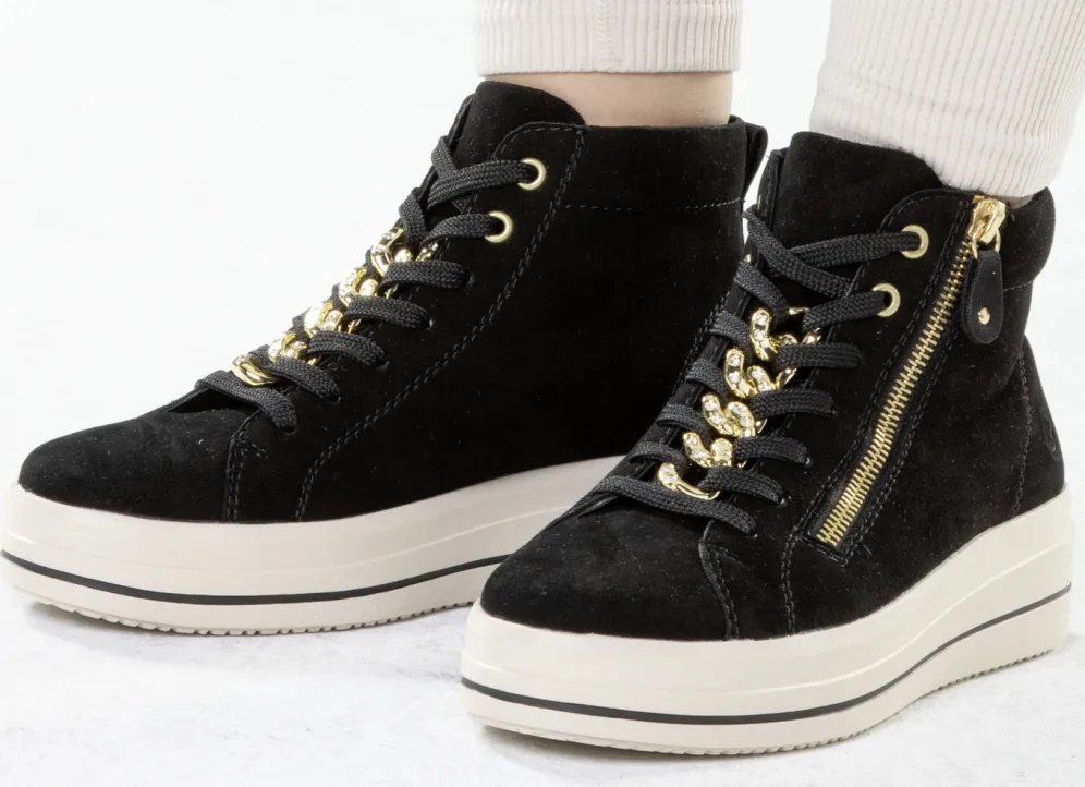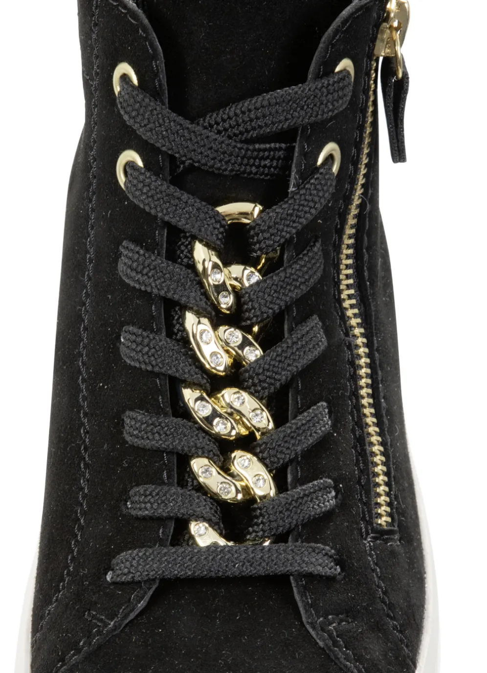 Modischer Bootie aus weichem Veloursleder: Weite G, Schnürung mit funkelnder Zierkette, seitlicher Reißverschluss, Textilfutter, herausnehmbares Fußbett, leichte 35mm PU-Plateausohle mit flachem Keil. Schafthöhe ca. 10 cm